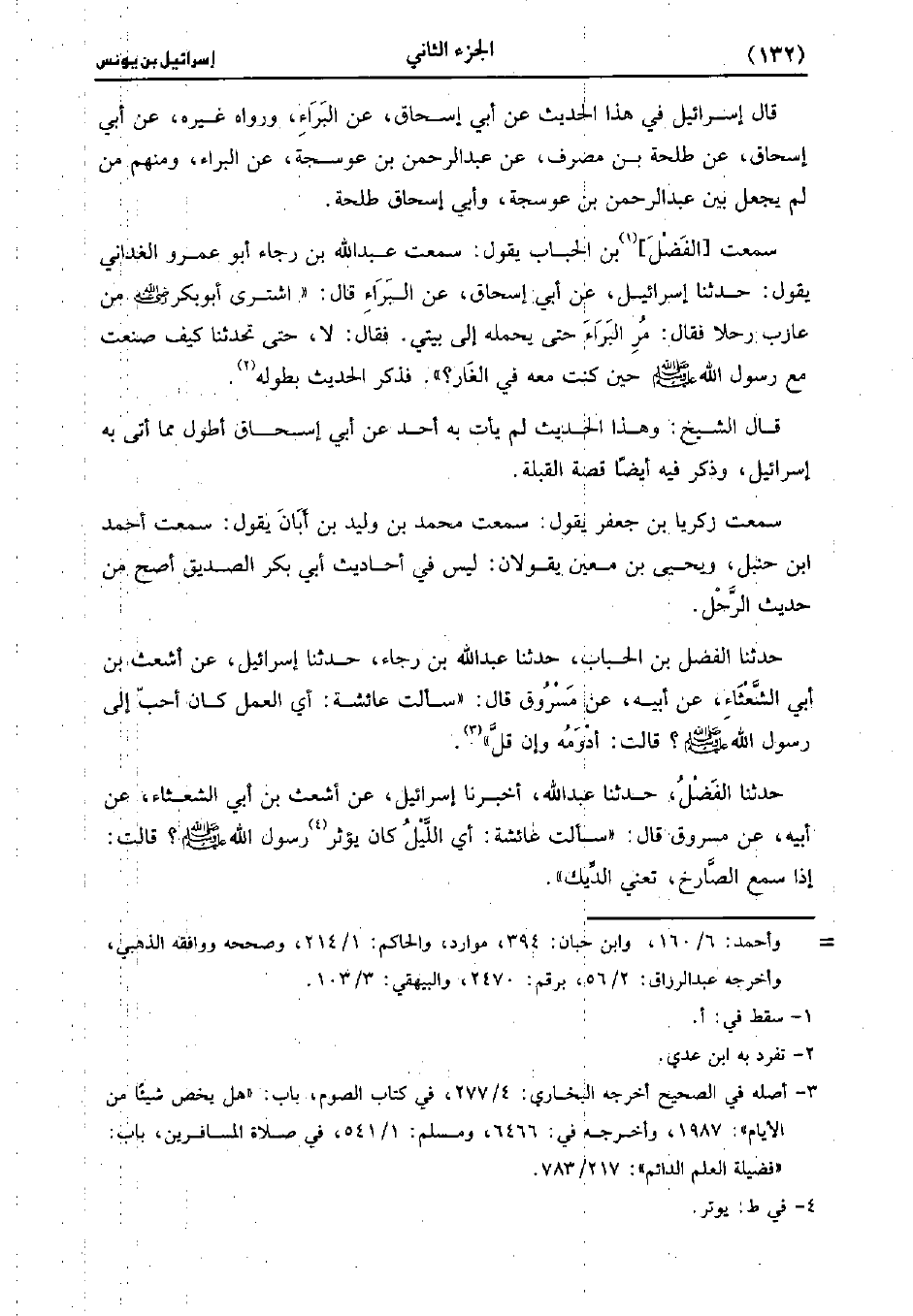 حَدَّثَنَا الْفَضْلُ، حَدَّثَنا عَبد اللَّهِ، أَخْبَرنا إِسْرَائِيلُ عَنْ أَشْعَثَ بْنِ أَبِي الشَّعْثَاءِ، عَنْ أَبِيهِ عَنْ مَسْرُوقٍ، قالَ: سَألتُ عَائِشَةَ أَيُّ اللَّيْلِ كَانَ يُؤْثِرُ رَسُولِ اللَّهِ صَلَّى اللَّهُ عَلَيْهِ وَسَلَّمَ قَالَتْ إِذَا سَمِعَ الصَّارِخَ تعني الديك