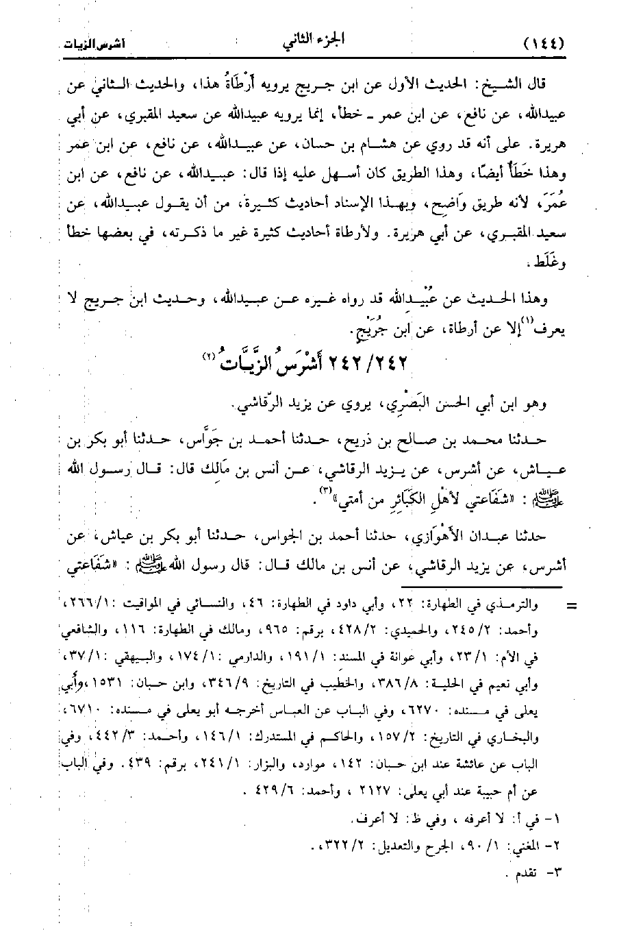 وهو بن أَبِي الْحَسَن البصري يروي عَن يزيد الرقاشي، حَدَّثَنا مُحَمد بْنُ صَالِحِ بْنِ ذُرَيْحٍ، حَدَّثَنا أَحْمَدُ بْنُ جَوَّاسٍ، حَدَّثَنا أَبُو بَكْرِ بْنُ عَيَّاشٍ عَنْ أَشْرَسَ عَنْ يَزِيدَ الرَّقَاشِيِّ، عَن أَنَس بْنِ مَالِكٍ، قَال: قَال رَسُولُ اللَّهِ صَلَّى اللَّهُ عَلَيْهِ وَسَلَّمَ شَفَاعَتِي لأَهْلِ الْكَبَائِرِ مِنْ أُمَّتِي.