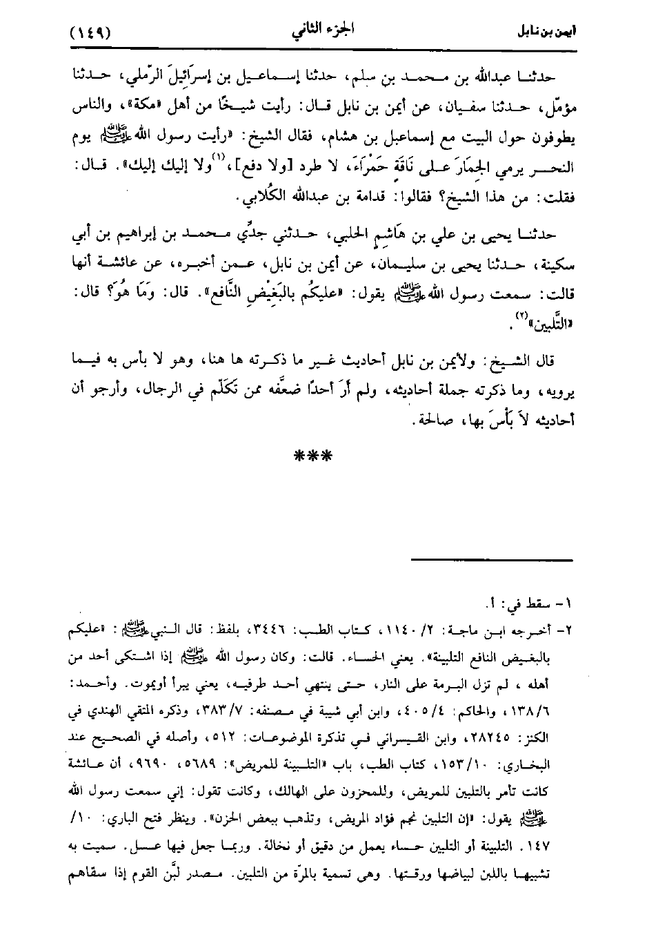 حَدَّثَنَا يَحْيى بْنُ عَلِيِّ بْنِ هَاشِمٍ الْحَلَبِيُّ، حَدَّثني جَدِّي مُحَمد بْنُ إِبْرَاهِيمَ بْنِ أَبِي سكينةَ، حَدَّثَنا يَحْيى بْنُ سُلَيْمَانَ عَنْ أَيْمَنَ بْنِ نَابِلٍ عَمَّنْ أَخْبَرَهُ عَنْ عَائِشَةَ أَنَّهَا قَالَتْ سَمِعْتُ رَسُولَ اللَّهِ صَلَّى اللَّهُ عَلَيْهِ وَسَلَّمَ يَقُولُ عَلَيْكُمْ بِالْبَغِيضِ النَّافِعِ قَالَ وَمَا هو قال التليين.