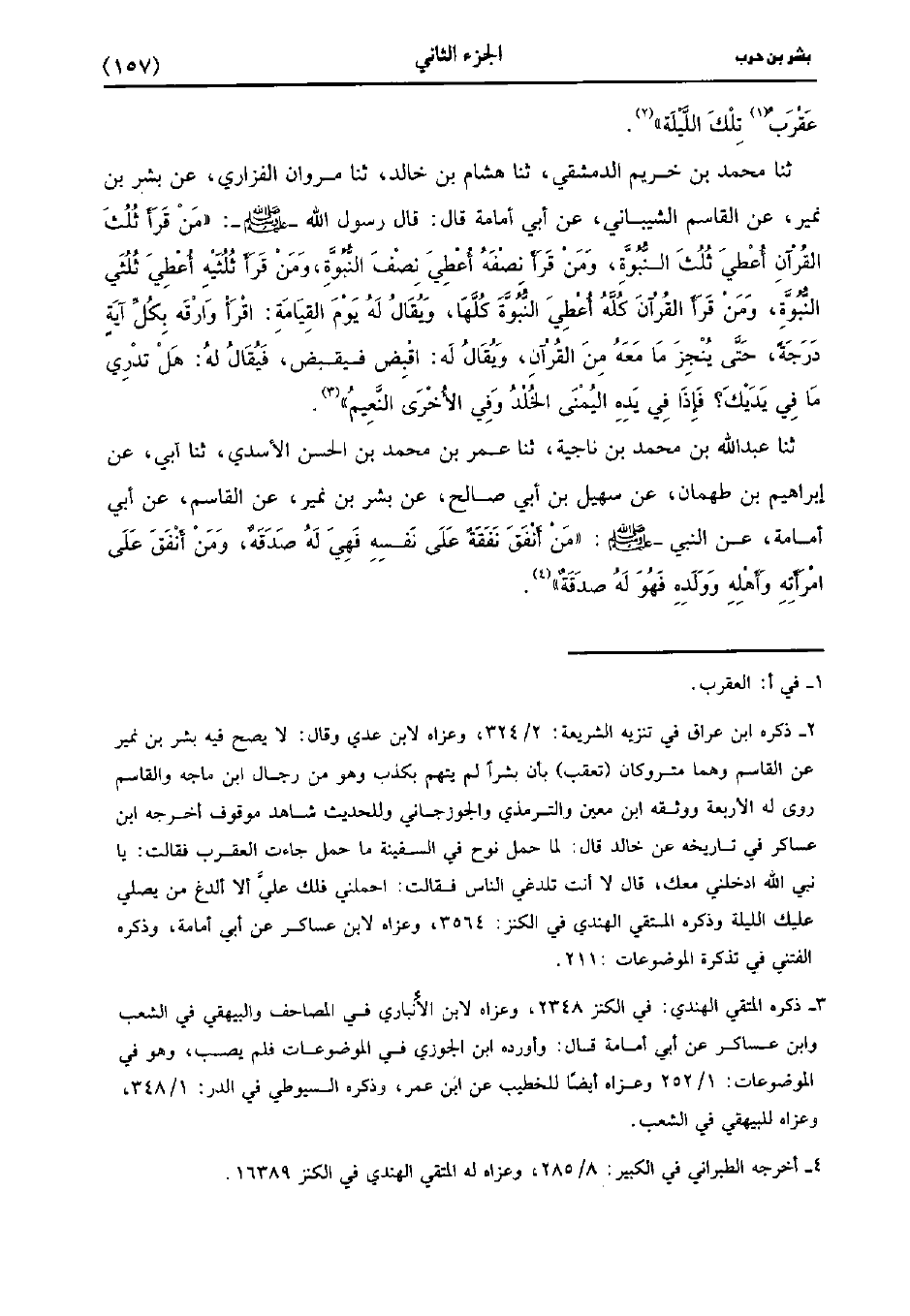 حَدَّثَنَا مُحَمد بْنُ خُرَيْمٍ الدِّمَشْقِيُّ، حَدَّثَنا هشام بن خالد، حَدَّثَنا مَرْوَانُ الْفَزَارِيُّ عَنْ بِشْرِ بْنِ نُمَير، عَنِ الْقَاسِمِ الشَّيْبَانِيِّ، عَن أَبِي أُمَامَةَ، قَال: قَال رَسُولُ اللَّهِ صَلَّى اللَّهُ عَلَيْهِ وَسَلَّمَ مَنْ قَرَأَ ثُلُثَ الْقُرْآنِ أُعْطِيَ ثُلُثَ النُّبُوَّةِ، ومَنْ قَرَأَ نِصْفَهُ أُعْطِيَ نِصْفَ النُّبُوَّةِ، ومَنْ قَرَأَ ثُلُثَيْهِ أُعْطِيَ ثُلُثَي النُّبُوَّةِ، ومَنْ قَرَأَ الْقُرْآنَ كُلَّهُ أُعْطِيَ النُّبُوَّةَ كُلَّهَا وَيُقَالُ لَهُ يَوْمَ الْقِيَامَةِ اقرأوارقه بِكُلِّ آيَةٍ دَرَجَةً حَتَّى يُنْجِزَ مَا مَعَهُ مِنَ الْقُرْآنِ وَيُقَالُ لَهُ اقْبِضْ فَيَقْبِضُ فَيُقَالُ لَهُ هَلْ تَدْرِي مَا فِي يَدَيْكَ فَإِذَا فِي يَدِهِ الْيُمْنَى الْخُلْدُ وفي الأخرى النعيم.