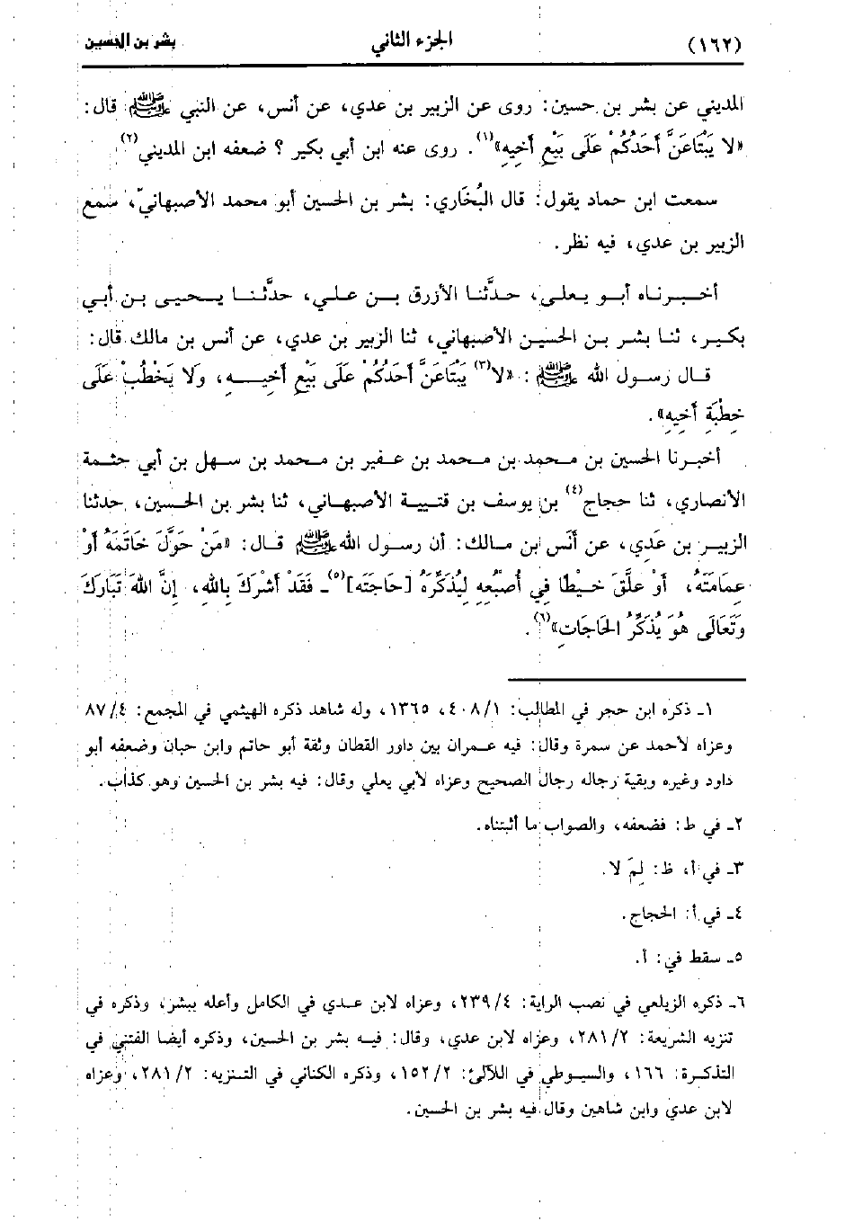 الْمَدِينِيُّ عَنْ بِشْرِ بْنِ حُسَيْنٍ رَوَى عَنِ الزُّبَيْرِ بْنِ عَدِيٍّ، عَن أَنَس عَنِ النَّبِيِّ صَلَّى اللَّهُ عَلَيه وسَلَّم قَال: لا يَبْتَاعَنَّ أَحَدُكُمْ عَلَى بَيْعِ أَخِيهِ روى عنه بن أَبِي بُكَير ضَعَّفَهُ ابْنُ الْمَدِينِيُّ.