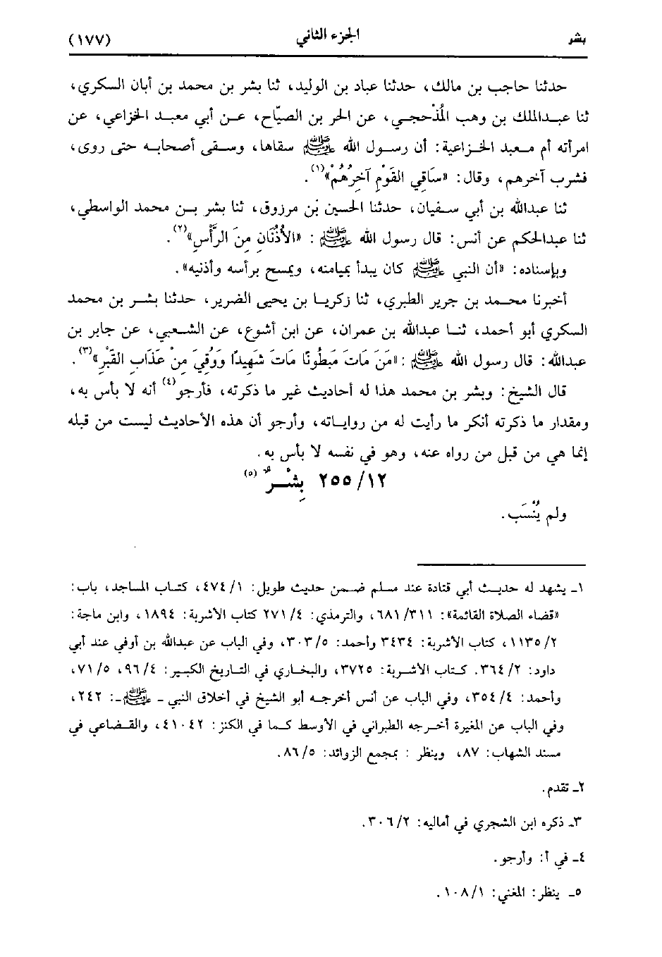 حَدَّثَنَا عَبد اللَّهِ بْنُ أَبِي سُفْيَانَ، حَدَّثَنا الْحُسَيْنُ بْنُ مَرْزُوقٍ، حَدَّثَنا بشر بن مُحَمد الواسطي، حَدَّثَنا عَبد الْحَكَمِ، عَن أَنَس قَال رَسُول اللهِ صَلَّى اللَّهُ عَلَيهِ وَسلَّمَ الأُذُنَانِ مِنَ الرَّأْسِ.