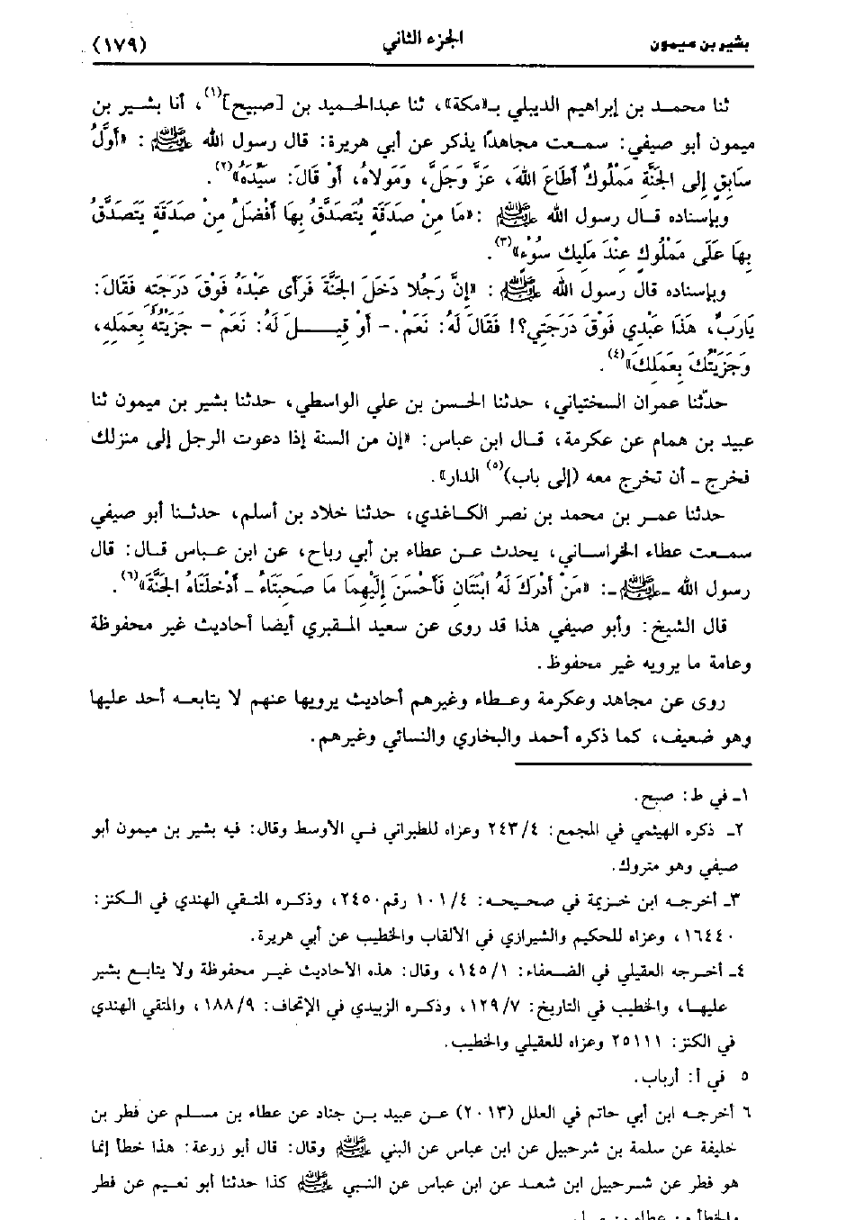 حَدَّثَنَا مُحَمد بن إبراهيم الديلبي بمكة، حَدَّثَنا عَبد الحميد بن صبح أنا بَشِيرُ بْنُ مَيْمُونٍ أَبُو صَيْفِيٍّ سَمِعْتُ مُجَاهِدًا يَذْكُرُ، عَن أَبِي هُرَيْرَةَ قَال رَسُول اللهِ صَلَّى اللَّهُ عَلَيهِ وَسلَّمَ أَوَّلُ سَابِقٍ إِلَى الْجَنَّةِ مَمْلُوكٌ أَطَاعَ اللَّهَ عَزَّ وَجَلَّ وَمَوْلاهُ أَوْ قَالَ سَيِّدَهُ.