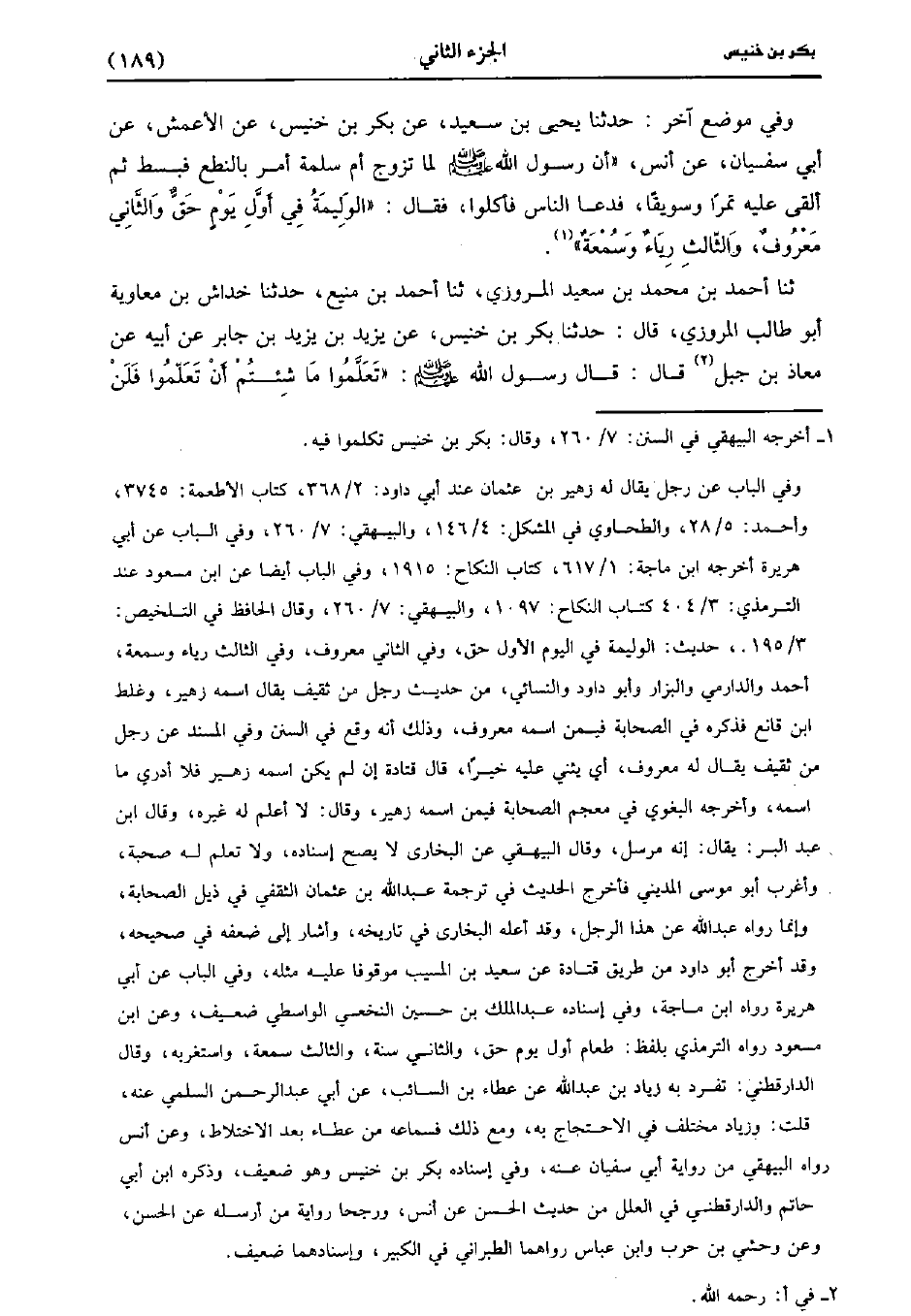 وَفِي مَوْضِعٍ آخَرَ، حَدَّثَنا يَحْيى بْن سَعِيد عَن بَكْر بْن خُنَيْسٍ، عَنِ الأَعْمَش، عَن أَبِي سُفيان، عَن أَنَسٍ أَنّ رَسُولَ اللَّهِ صَلَّى اللَّهُ عَلَيْهِ وَسَلَّمَ لَمَّا تَزَوَّجَ أَمَّ سَلَمَةَ أَمَرَ بِالنِّطَعِ فَبُسِطَ ثُمَّ أَلَقَى عَلَيْهِ تَمْرًا وَسَوِيقًا فَدَعَا النَّاسَ فَأَكَلُوا فَقَالَ الْوَلِيمَةُ فِي أَوَّلِ يَوْمٍ حَقٌّ وَالثَّانِي مَعْرُوفٌ وَالثَّالِثُ رِيَاءً وسمعة.