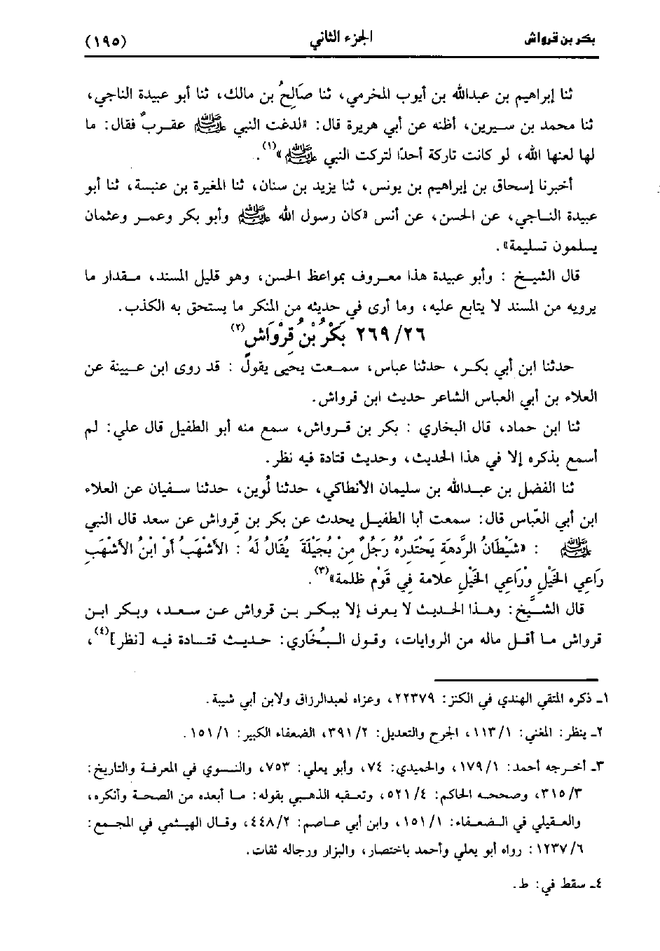 حَدَّثَنَا الفضل بن عَبد اللَّه بْنِ سُلَيْمَانَ الأَنْطَاكِيُّ، حَدَّثَنا لُوَيْنٌ، حَدَّثَنا سُفيان، عَن الْعَلاءِ بْنِ أَبِي الْعَبَّاسِ، قَالَ: سَمِعْتُ أَبَا الطُّفَيْلِ يُحَدِّثُ عَنْ بَكْرِ بْنِ قِرْوَاشٍ عَنْ سَعْدٍ قَالَ النَّبِيُّ صَلَّى اللَّهُ عَلَيهِ وَسلَّمَ شَيْطَانُ الرَّدْهَةِ يَحْتَدِرُهُ رَجُلٌ مِنْ بُجَيْلَةَ، يُقَال لَهُ: الأَشْهَبُ، أَوِ ابْنُ الأشهب راعي الخيل أو راعي الْخَيْلِ عَلامَةٌ فِي قَوْمٍ ظَلَمَةٍ.