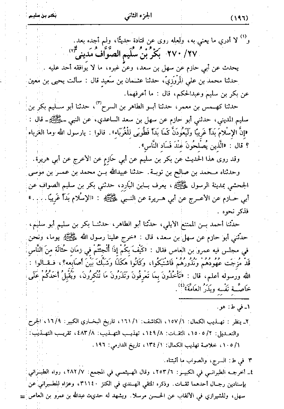 حَدَّثَنَا كَهْمَسُ بْنُ مَعْمَرٍ، حَدَّثَنا أَبُو الطَّاهِرِ بن السرج، حَدَّثَنا أَبُو سُلَيْمِ بَكْرُ بْنُ سُلَيْمٍ الْمَدِينِيُّ، حَدَّثني أَبُو حَازِمٍ عَنْ سَهْلِ بْنِ سَعْدٍ السَّاعِدِيِّ عَنِ النَّبِيِّ صَلَّى اللَّهُ عَلَيه وسَلَّم قَال: إِنَّ الإِسْلامَ بَدَأَ غريبا وليعودن كما بدأفطوبى لِلْغُرَبَاءِ قَالُوا يَا رَسُولَ اللهِ وَمَا الْغُرَبَاءُ قَالَ الَّذِينَ يُصْلِحُونَ عِنْدَ فَسَادِ النَّاسِ.