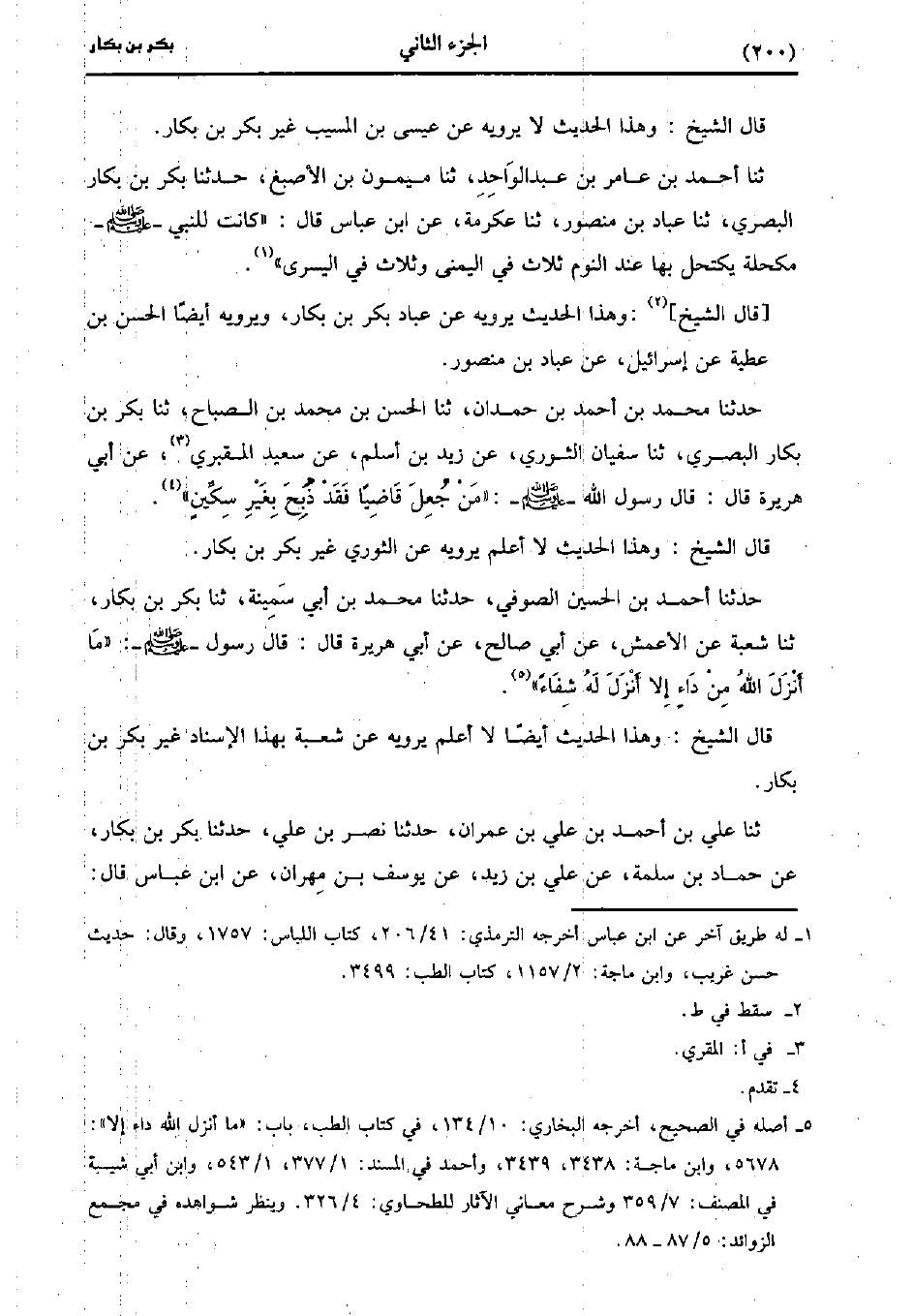 قَالَ الشَّيْخُ: وَهَذَا الْحَدِيثُ يَرْوِيهِ عَنْ عَبَّادٍ بَكْرُ بْنُ بَكَّارٍ وَيَرْوِيهِ أَيضًا الْحَسَنُ بْنُ عَطِيَّةَ عَنْ إِسْرَائِيلَ عَنْ عَبَّادِ بْنِ مَنْصُورٍ.