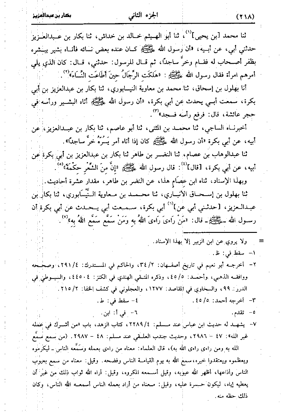 حَدَّثَنَا بهلول بن إسحاق، حَدَّثَنا مُحَمد بْنُ معاوية النيسابوري، حَدَّثَنا بكار بْن عَبد العزيز بْن أَبِي بَكْرَةَ سَمِعْتُ أَبِي يُحَدِّثُ، عَن أَبِي بَكْرَةَ أَنَّ رَسُولَ اللَّهِ صَلَّى اللَّهُ عَلَيْهِ وَسَلَّمَ أَتَاهُ الْبَشِيرُ وَرَأْسُهُ فِي حِجْرِ عَائِشَةَ قَالَ فَرَفَعَ رَأْسَهُ فَسَجَدَ.