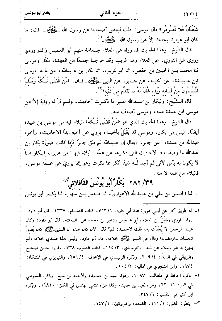 قال الشيخ: وَهَذَا الْحَدِيثُ قَدْ رَوَاهُ، عَن العَلاَء جَمَاعَةٌ مِنْهُمْ أَبُو الْعُمَيْسِ والداروردي وَرَوَى عَنِ الثَّوْريّ، عَن العَلاَء، وَهو غَرِيبٌ وَقَدْ خَرَجَا جَمِيعًا من العهدة بكار وموسى، حَدَّثَنا مُحَمد بْنُ الْحُسَيْنِ بْنِ حَفْصٍ، حَدَّثَنا أَبُو كُرَيْبٍ، حَدَّثَنا بَكَّارُ بْنُ عَبد اللَّهِ، عَن عَمِّه مُوسَى بْنِ عُبَيْدَةَ عَنْ أَخِيهِ عَنْ جَابِرٍ عَنِ النَّبِيِّ صَلَّى اللَّهُ عَلَيهِ وَسلَّمَ مِنَ قَضَى نُسُكَهُ وَسَلِمَ الْمُسْلِمُونَ مِنْ لِسَانِهِ وَيَدِهِ غُفِرَ لَهُ مَا تَقَدَّمَ مِنْ ذَنْبِهِ.