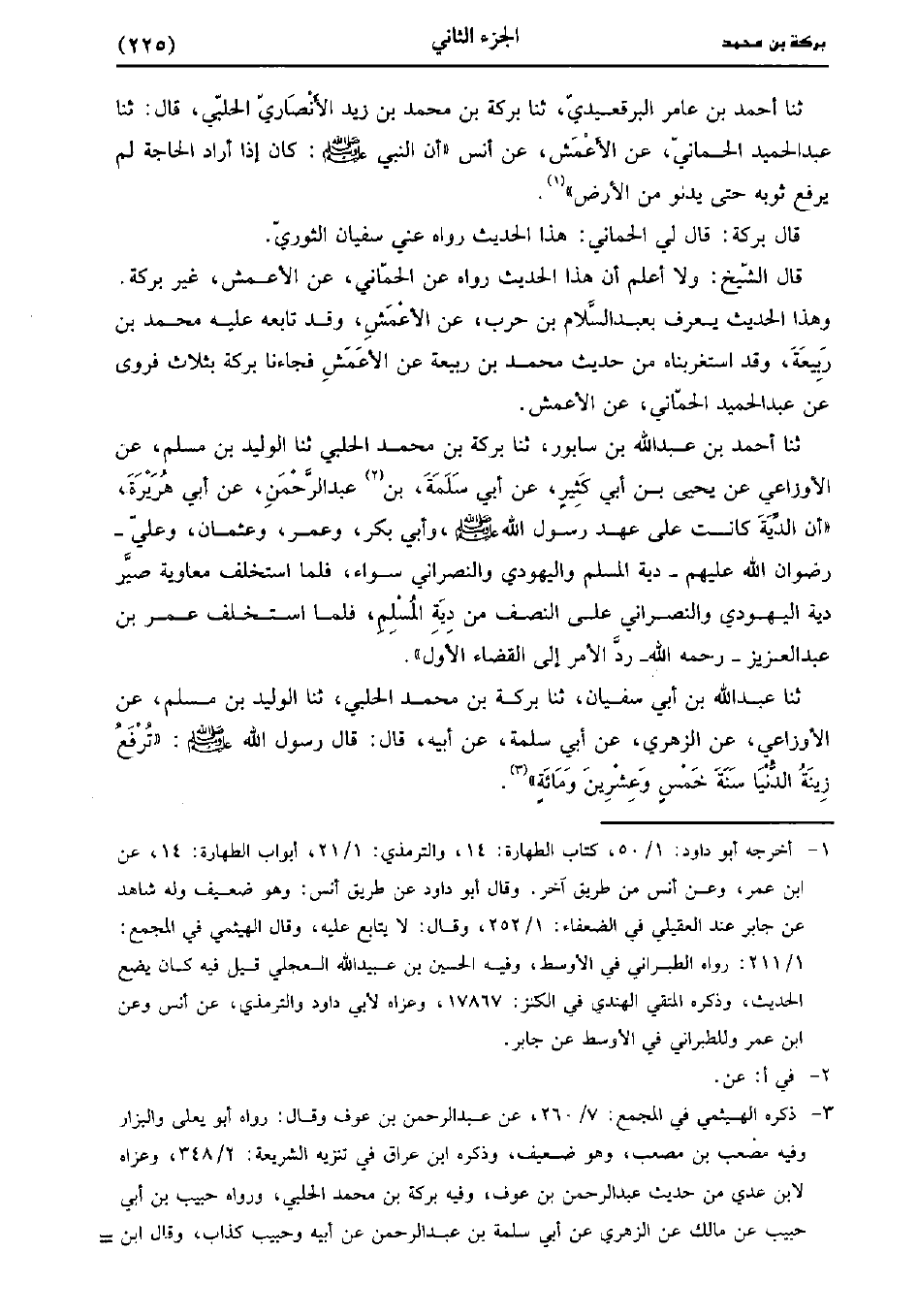 حَدَّثَنَا أَحْمَدُ بْنُ عَبد الله بن سابور، حَدَّثَنا بركة بن مُحَمد الحلبي، حَدَّثَنا الْوَلِيدُ بْنُ مُسْلِمٍ عَنْ الأَوْزاعِيّ، عَن يَحْيى بْنِ أَبِي كَثِيرٍ، عَن أَبِي سَلَمَةَ بْنِ عَبد الرَّحْمَنِ، عَن أَبِي هُرَيْرَةَ أَنَّ الدِّيَّةَ كَانَتْ عَلَى عَهْدِ رَسُولِ اللَّهِ صَلَّى اللَّهُ عَلَيْهِ وَسَلَّمَ وَأَبِي بَكْرٍ وَعُمَرَ وَعُثْمَانَ، وَعلي رضي الله عنهم دِيَّةُ الْمُسْلِمِ وَالْيَهُودِيِّ وَالنَّصْرَانِيِّ سَوَاءً فَلَمَّا اسْتُخْلِفَ مُعَاوِيَةُ صَيَّرَ دِيَّةَ الْيَهُودِيِّ وَالنَّصْرَانِيِّ عَلَى النِّصْفِ مِنْ دِيَّةِ الْمُسْلِمِ فَلَمَّا اسْتُخْلِفَ عُمَر بْنُ عَبد الْعَزِيزِ رَحِمَهُ اللَّهُ رَدَّ الأَمْرَ إِلَى الْقَضَاءِ الأَوَّلِ.