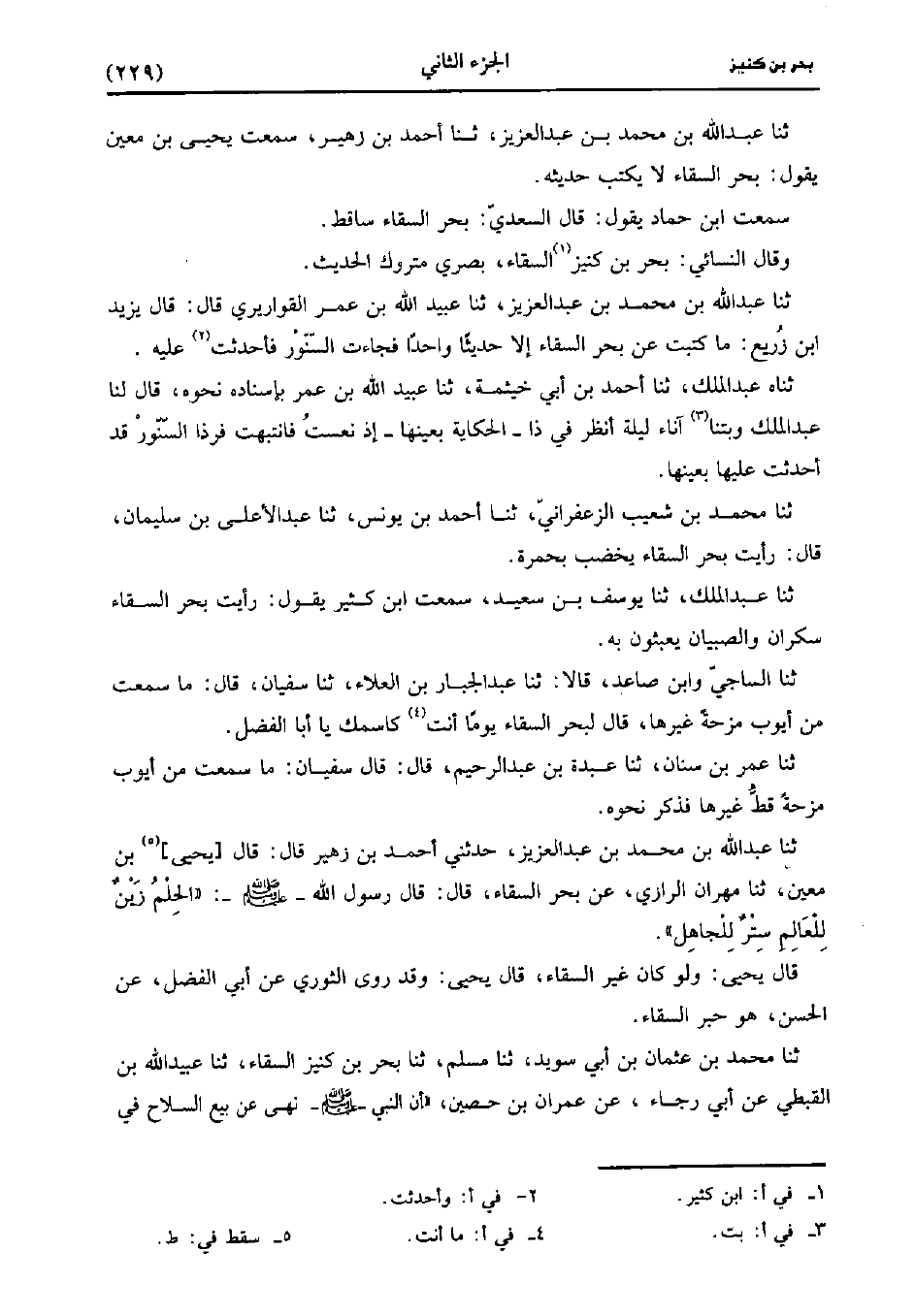 حَدَّثَنَا عَبد اللَّه بْنُ مُحَمد بْنِ عَبد الْعَزِيزِ، حَدَّثَنا أَحْمَدُ بْن زهير سَمِعْتُ يَحْيى بْن مَعِين يَقُولُ بَحْرٌ السَّقَّاءُ لا يكتب حديثه.