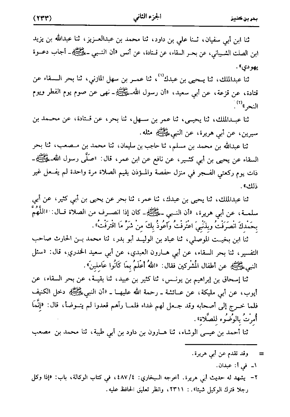 حَدَّثَنَا عَبد الملك، حَدَّثَنا يَحْيى، حَدَّثَنا عُمَر بن سهل، حَدَّثَنا بَحْرٌ، عَن قَتادَة عَنْ مُحَمد بْنِ سِيرِين، عَن أَبِي هُرَيْرَةَ عَنِ النَّبِيِّ صَلَّى اللَّهُ عَلَيهِ وَسلَّمَ مِثْلَهُ.