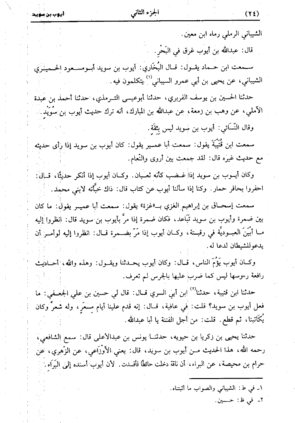 حَدَّثَنَا ابْنُ قُتَيْبَةَ، حَدَّثَنا ابْنُ أَبِي السُّرِّيِّ، قَال: قَال لِي حُسَيْنُ بْنُ عَلِيٍّ الْجُعْفِيُّ مَا فَعَلَ أَيُّوبُ بْنُ سُوَيْدٍ قُلْتُ فِي عَافِيَةٍ قَالَ إِنَّهُ قَدِمَ عَلَيْنَا أَيَّامَ مِسْعَرٍ وَلَهُ شِعْرٌ وَكَانَ يُكَاتِبُنَا ثُمَّ قَطَعَ قُلْتُ مِنْ أَجْلِ الْفِتْنَةِ يَا أَبَا عَبد اللَّهِ.