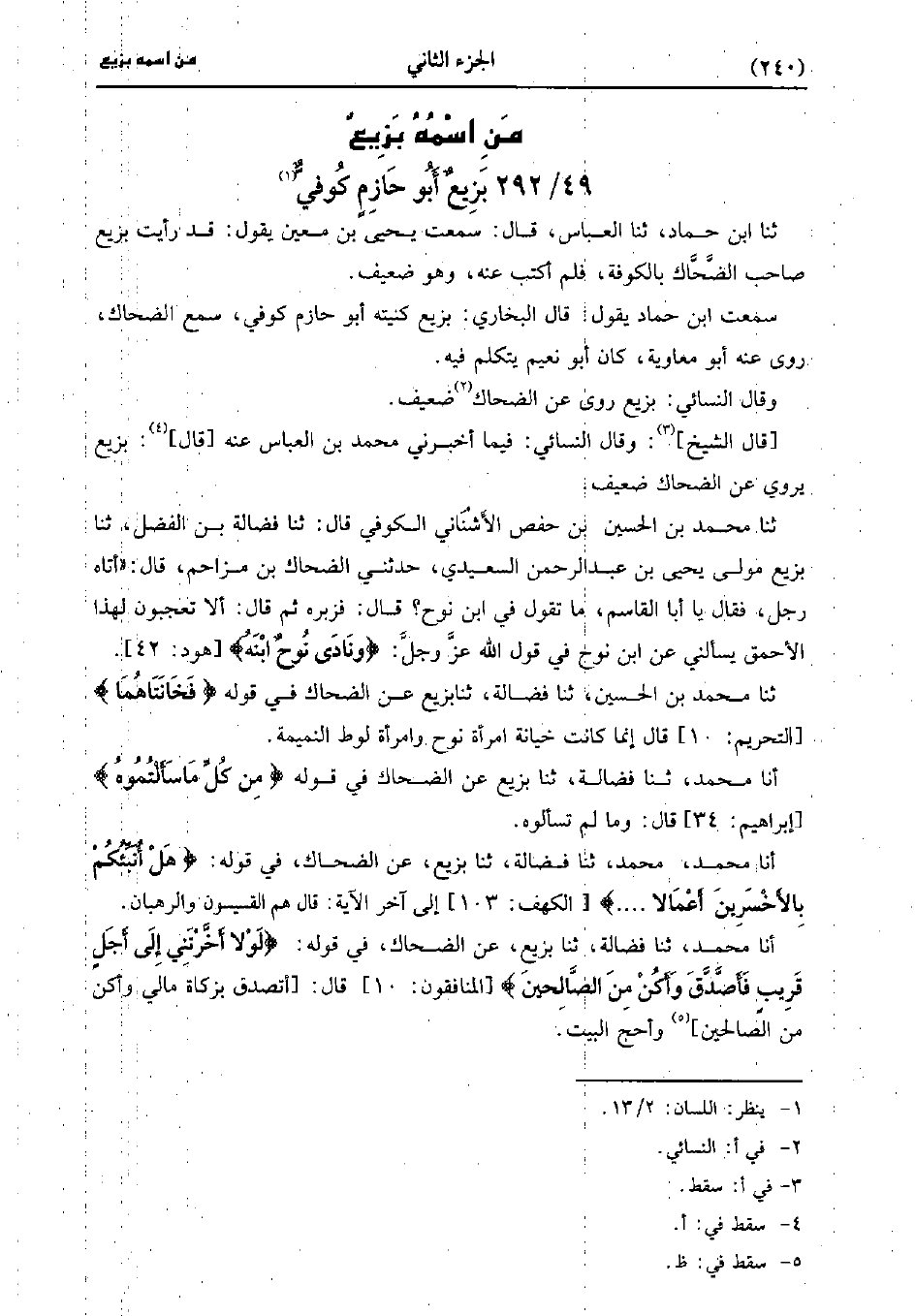 حَدَّثَنَا مُحَمد بْنُ الْحُسَيْنِ بْنِ حفص الأشناني الكوفي، قَال: حَدَّثَنا فضالة بن الفضل، حَدَّثَنا بَزِيعٌ مَوْلَى يَحْيى بْنُ عَبد الرَّحْمَنِ السَّعِيدِيُّ، حَدَّثني الضَّحَّاكُ بْنُ مُزَاحِمٍ قَالَ أَتَاهُ رَجُلٌ، فَقَالَ، يَا أَبَا الْقَاسِمِ مَا تَقُولُ في بن نُوحٍ قَالَ فَزَبَرَهُ ثُمّ قَالَ أَلا تَعْجَبُونَ لِهَذَا الأَحْمَقِ يَسْأَلُنِي، عنِ ابْنِ نُوحٍ فِي قَوْلِ الله عَزَّ وَجَلَّ قال نوح لابنه.