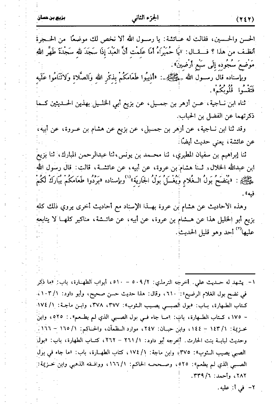 حَدَّثَنَا إبراهيم بن سفيان المطيري، حَدَّثَنا مُحَمد بْن يُونُس، حَدَّثَنا عَبد الرحمن المبارك، حَدَّثَنا بَزِيعُ بْنُ عَبد اللَّهِ الْخَلالُ، حَدَّثَنا هِشَامُ بْنُ عُرْوَةَ، عَنْ أَبِيهِ عَنْ عَائِشَةَ قَالَتْ قَال رَسُول اللهِ صَلَّى اللَّهُ عَلَيهِ وَسلَّمَ يُنْضَحُ بَوْلُ الْغُلامِ وَيُغْسَلُ بَوْلُ الْجَارِيَةِ وَبِإِسْنَادِهِ؛ بَرِّدُوا طَعَامَكُمْ يُبَارَكُ لَكُمْ فِيهِ.