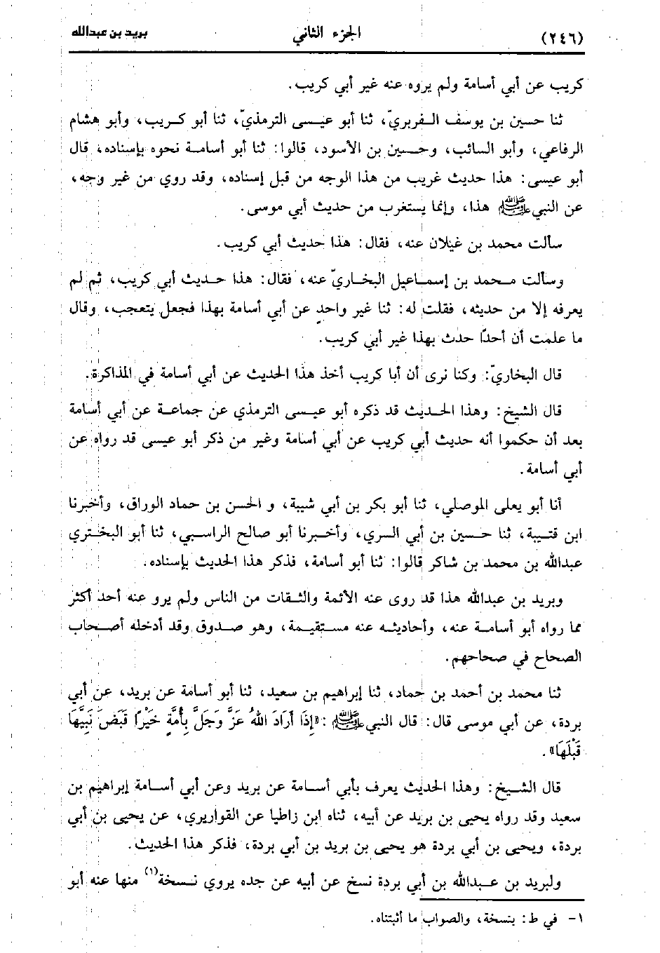 حَدَّثَنَا حُسَيْنُ بْنُ يُوسُفَ الْفَرْبَرِيُّ، حَدَّثَنا أبو عيسى التِّرمِذِيّ، حَدَّثَنا أَبُو كُرَيْبٍ، وأَبُو هِشَامٍ الرِّفَاعِيُّ، وأَبُو السائب وحسين بن الأسود قالوا، حَدَّثَنا أَبُو أُسَامَةَ نَحْوَهُ بِإِسْنَادِهِ قَالَ أَبُو عِيسَى هَذَا حَدِيثٌ غَرِيبٌ مِنْ هَذَا الْوَجْهِ مِنْ قِبَلِ إِسْنَادِهِ وَقَدْ رُوِيَ مِنْ غَيْرِ وَجْهٍ عَنِ النَّبِيِّ صَلَّى اللَّهُ عَلَيهِ وَسلَّمَ هَذَا، وإِنَّما يُسْتَغْرَبُ مِنْ حَدِيثِ أَبِي مُوسَى.