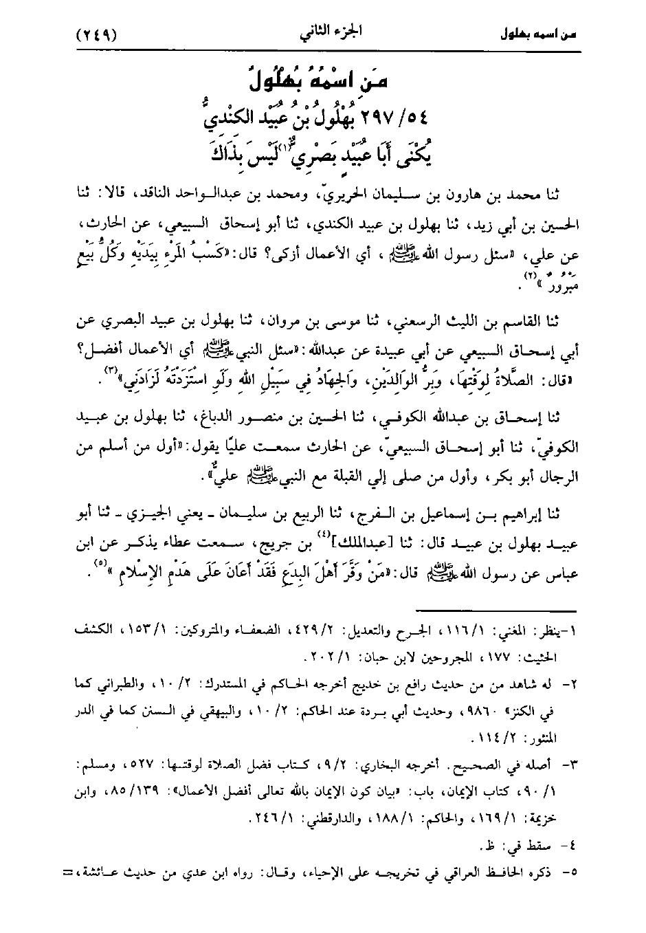 حَدَّثَنَا إِسْحَاقُ بْنُ عَبد اللَّهِ الكوفي، حَدَّثَنا الحسين بن منصور الدباغ، حَدَّثَنا بهلول بن عُبَيد الكوفي، حَدَّثَنا أَبُو إِسْحَاقَ السَّبِيعيُّ عَنِ الْحَارِثِ سَمِعْتُ عَلِيًّا يَقُولُ أَوَّلُ مَنْ أَسْلَمَ مِنَ الرِّجَالِ أَبُو بَكْرٍ وَأَوَّلُ مَنْ صَلَّى الْقِبْلَةَ مِعَ النَّبِيُّ صَلَّى اللَّهُ عَلَيهِ وَسلَّمَ علي.