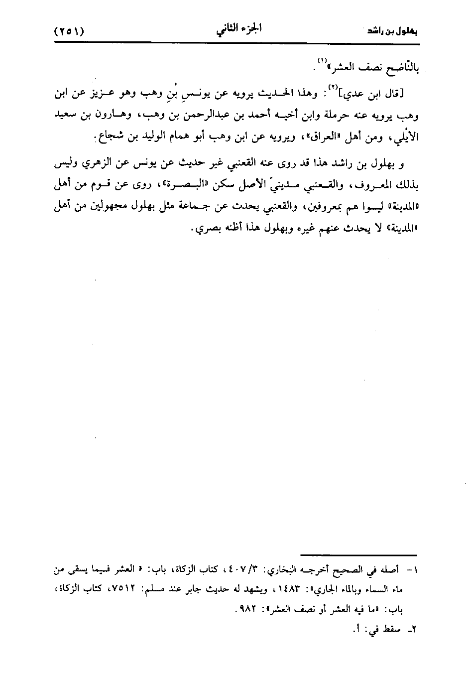 وَبُهْلُولُ بْنُ رَاشِدٍ هَذَا قَدْ رَوَى عَنْهُ الْقَعْنَبِيُّ غَيْرَ حَدِيثٍ عَنْ يُونُس، عنِ الزُّهْريّ وَلَيْسَ بِذَلِكَ الْمَعْرُوفُ وَالْقَعْنَبِيُّ مَدِينِيُّ الأَصْلِ سَكَنَ الْبَصْرَةَ رَوَى عَنْ قَوْمٍ مِنْ أَهْلِ الْمَدِينَةِ لَيْسُوا هُمْ بِمَعْرُوفِينَ وَالْقَعْنَبِيُّ يُحَدِّثُ عَنْ جَمَاعَةٍ مِثْلِ بُهْلُولٍ مَجْهُولِينَ مِنْ أَهْلِ الْمَدِينَةِ، ولاَ يُحَدِّثُ عَنْهُمْ غَيْرُهُ وبهلول هذا أظنه بصري