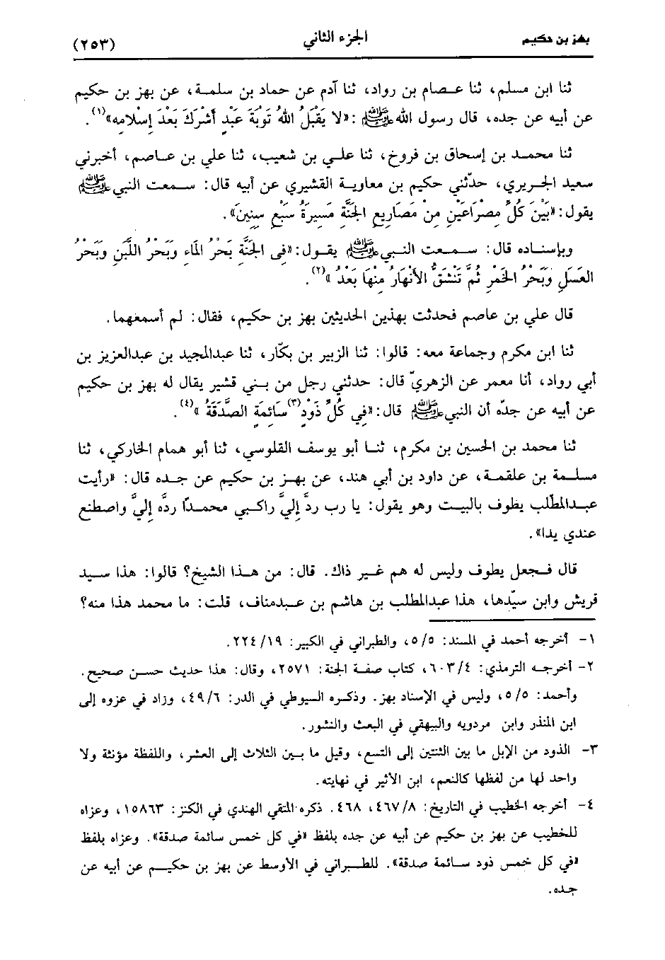 حَدَّثَنَا ابْنُ مُكْرَمٍ وَجَمَاعَةٌ مَعَهُ قَالُوا، حَدَّثَنا الزُّبَيْرُ بْنُ بَكَّارٍ، حَدَّثَنا عَبد الْمَجِيدِ بْنُ عَبد الْعَزِيزِ بْنِ أَبِي رَوَّادٍ أنا مَعْمَرٍ، عنِ الزُّهْريّ، قَال: حَدَّثني رَجُلٌ مِنْ بَنِي قُشَيْرٍ، يُقَال لَهُ: بَهْزُ بْنُ حَكِيمٍ، عَنْ أَبِيهِ، عَن جَدِّهِ أَنَّ النَّبِيَّ صَلَّى اللَّهُ عَلَيه وسَلَّم قَال: فِي كُلِّ ذود سائمة الصدقة.