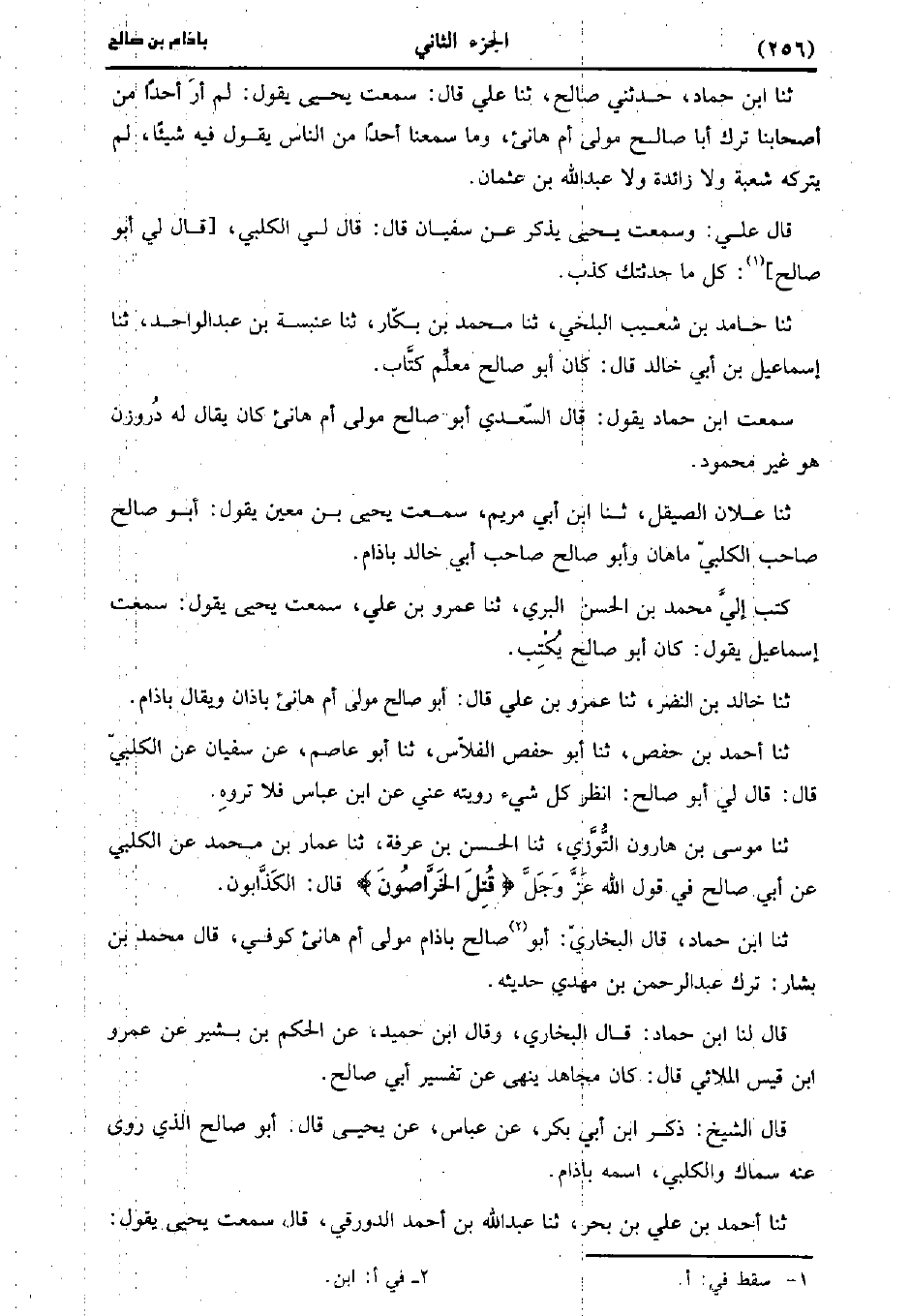 حَدَّثَنَا ابن حماد، حَدَّثني صالح، حَدَّثَنا علي، قَالَ: سَمِعْتُ يَحْيى يَقُولُ: لم أر أحدا من أصحابنا ترك أبا صَالِح مولى أم هانئ وما سمعنا أحدا من النَّاس يَقُولُ فيه شيئا لم يتركه شُعْبَة، ولاَ زائدة، ولاَ عَبد اللَّهِ بْن عُثْمَان.