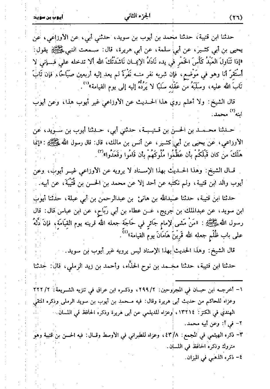 حَدَّثَنَا ابْنُ قُتَيْبَةَ، حَدَّثَنا مُحَمد بْنُ أَيُّوبَ بْنِ سُوَيْدٍ، حَدَّثني أَبِي عَنِ الأَوْزاعِيّ، عَن يَحْيى بْنِ أَبِي كَثِيرٍ، عَن أَبِي سَلَمَةَ، عَن أَبِي هُرَيْرَةَ، قَالَ: سَمِعْتُ النَّبِيَّ صَلَّى اللَّهُ عَلَيهِ وَسلَّمَ يَقُولُ إِذَا تَنَاوَلَ الْعَبْدُ كاس من الْخَمْرِ فِي يَدِهِ نَادَاهُ الإِيمَانُ ناشدتك الله ان تُدْخِلَهُ عَلِيَّ فَإِنِّي لا أَسْتَقِرُّ أَنَا، وَهو فِي مَوْضِعٍ فَإِنْ شَرِبَهُ نَفَرَ مِنْهُ نَفْرَةً لَمْ يَعُدْ إِلَيْهِ أَرْبَعِينَ صَبَاحًا فَإِنْ تَابَ تَابَ اللَّهُ عَلَيْهِ وَسَلَبَهُ مِنْ عَقْلِهِ سَلْبًا لا يَرُدُّهُ إِلَيْهِ إِلَى يَوْمِ الْقِيَامَةِ.