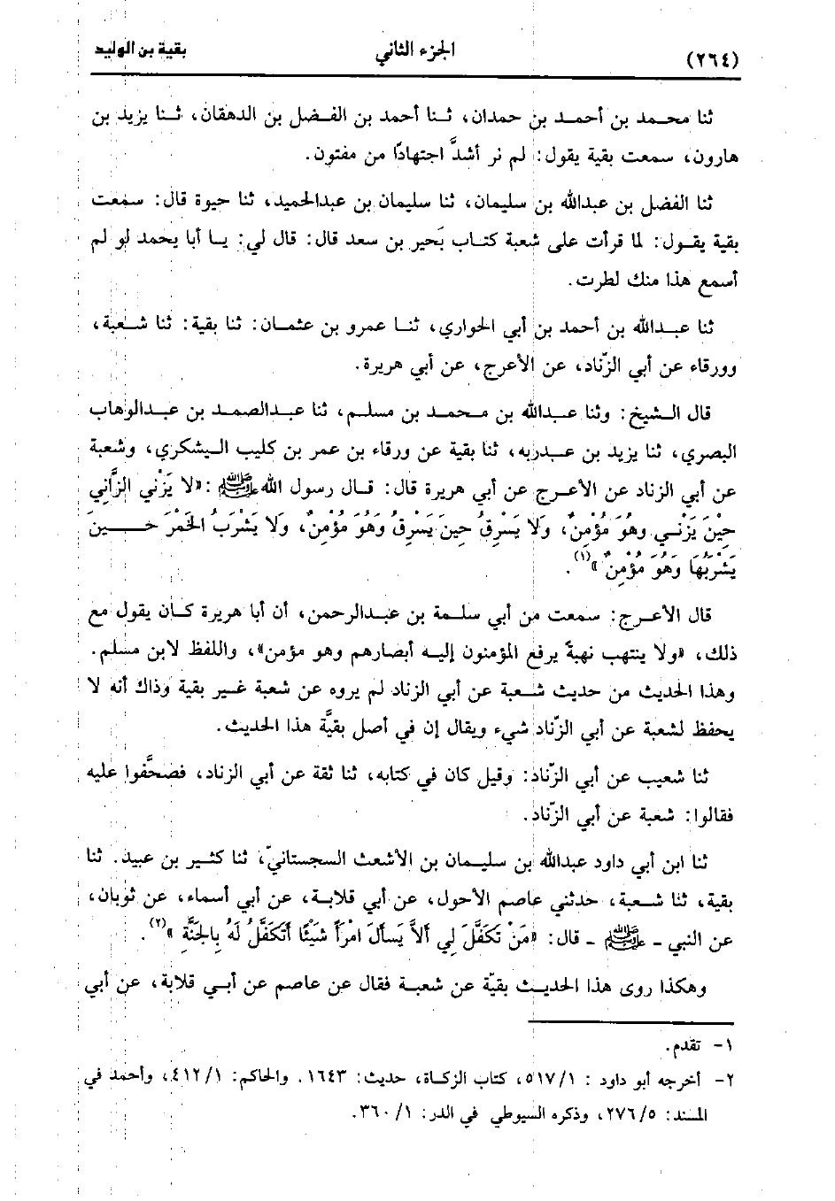 قال الشيخ: وَحَدَّثنا عَبد اللَّهِ بْنُ مُحَمد بن مسلم، حَدَّثَنا عَبد الصَّمَدِ بْنُ عَبد الوهاب البصري، حَدَّثَنا يزيد بن عَبد ربه، حَدَّثَنا بَقِيَّةُ عَنْ وَرْقَاءَ بْنِ عُمَر بْنِ كُلَيْبٍ الْيَشْكُرِيِّ، وشُعبة، عَن أَبِي الزِّنَادِ عَنِ الأَعْرَجِ، عَن أَبِي هُرَيْرَةَ، قَال: قَال رَسُولُ اللَّهِ صَلَّى اللَّهُ عَلَيْهِ وَسَلَّمَ: لاَ يَزْنِي الزَّانِي حِينَ يَزْنِي، وَهو مُؤْمِنٌ، ولاَ يَسْرِقُ حِينَ يَسْرِقُ، وَهو مُؤْمِنٌ، ولاَ يَشْرَبُ الْخَمْرَ حِينَ يَشْرَبُهَا، وَهو مُؤْمِنٌ.