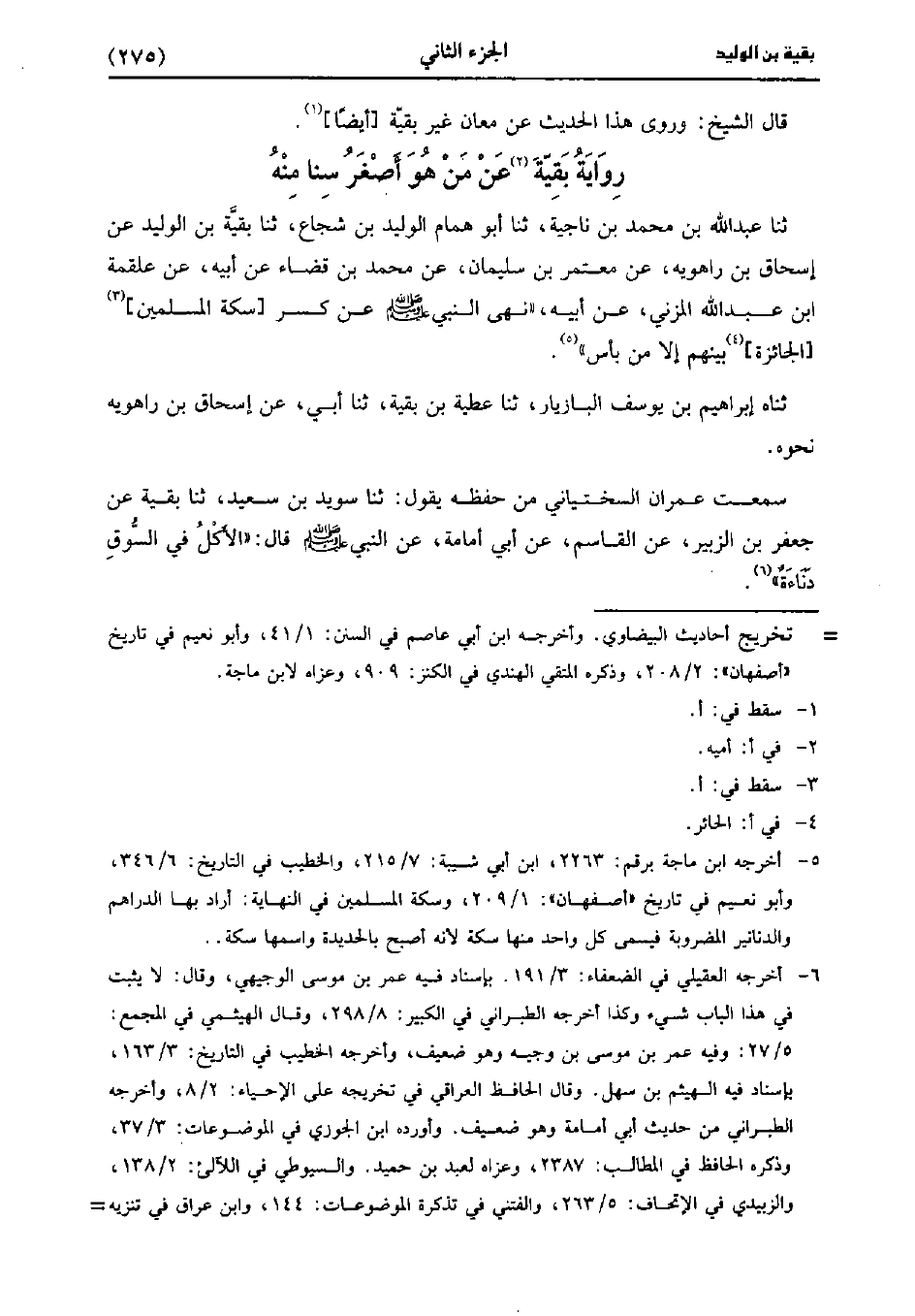 سَمِعْتُ عِمْرَانَ السِّخْتِيَانِيَّ مِنْ حفظه يقول، حَدَّثَنا سُوَيْدُ بْنُ سَعِيد، حَدَّثَنا بَقِيَّةُ عَنْ جَعْفَرِ بْنِ الزُّبَيْرِ، عَنِ الْقَاسِمِ، عَن أَبِي أُمَامَةَ عَنِ النَّبِيِّ صَلَّى اللَّهُ عَلَيه وسَلَّم قَال: الأَكْلُ فِي السُّوقِ دناءة