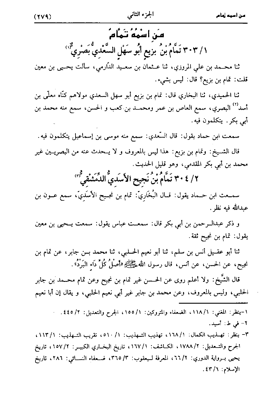 حَدَّثَنَا الحميدي، حَدَّثَنا البُخارِيّ قَالَ تمام بْن بزيع أَبُو سهل السعدي مولاهم كناه معلى بْن أسد البصري سمع العاص بْن عُمَر، وَمُحمد بْن كعب والحسن سمع مِنْهُ مُحَمد بْن أَبِي بَكْر يتكلمون فيه.