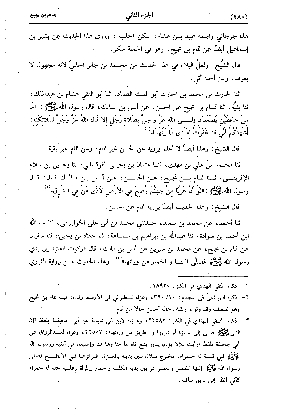 حَدَّثَنَا الْحَارِثُ بْنُ مُحَمد بْنِ الحارث أبو الليث الصياد، حَدَّثَنا أَبُو التَّقِيِّ هِشَامُ بْنُ عَبد الملك، حَدَّثَنا بقية، حَدَّثَنا تَمَّامِ بْنِ نُجَيْحٍ عَنِ الْحَسَنِ، عَن أَنَس بْنِ مَالِكِ قَال رَسُول اللهِ صَلَّى اللَّهُ عَلَيهِ وَسلَّمَ مَا مِنْ حَافِظَيْنِ يَصْعَدَانِ إِلَى اللَّهِ عَزَّ وَجَلَّ بِصَلاةِ رَجُلٍ إِلا قَالَ اللَّهُ عَزَّ وَجَلَّ لِمَلائِكَتِهِ أُشْهِدُكُمْ أَنِّي قَدْ غَفَرْتُ لِعَبْدِي مَا بَيْنَهُمَا.