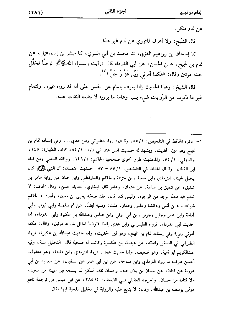 قَالَ الشَّيْخُ: وهذا الْحَدِيث إِنَّمَا يعرف بتمام عَن الْحَسَن عَلَى أَنَّهُ قد رواه غيره ولتمام غَيْرَ مَا ذَكَرْتُ مِنَ الرِّوَايَاتِ شيء يسير وعامة ما يرويه لا يتابعه الثقات عليه
