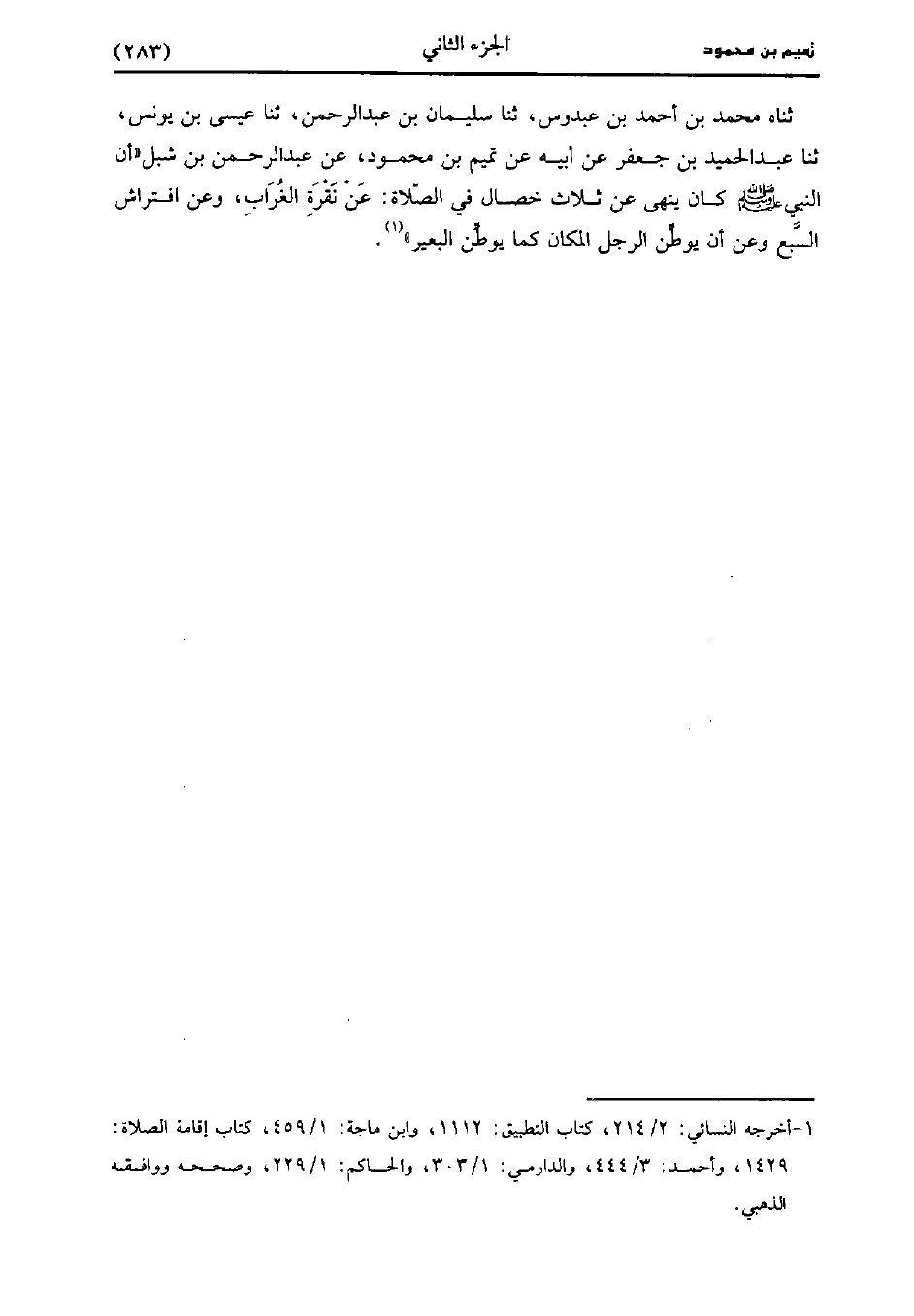 حَدَّثَنَاهُ مُحَمد بْنُ أَحْمَدَ بْنِ عبدوس، حَدَّثَنا سُلَيْمَانُ بْنُ عَبد الرَّحْمَنِ، حَدَّثَنا عِيسَى بْنُ يُونُس، حَدَّثَنا عَبد الْحَمِيدِ بْنِ جَعْفَرٍ، عَنْ أَبِيهِ عَنْ تَمِيمِ بْنِ مَحْمُودٍ عَن عَبد الرَّحْمَنِ بْن شبل أَنّ النَّبِيَّ صَلَّى اللَّهُ عَلَيهِ وَسلَّمَ كَانَ يَنْهَى عَنْ ثَلاثَةِ خِصَالٍ فِي الصَّلاةِ عَنْ نَقْرَةِ الْغُرَابِ وَعَنِ افْتِرَاشِ السَّبْعِ وَعَنْ أَنْ يُوَطِّنَ الرَّجُلُ الْمَكَانَ كَمَا يوطن البعير