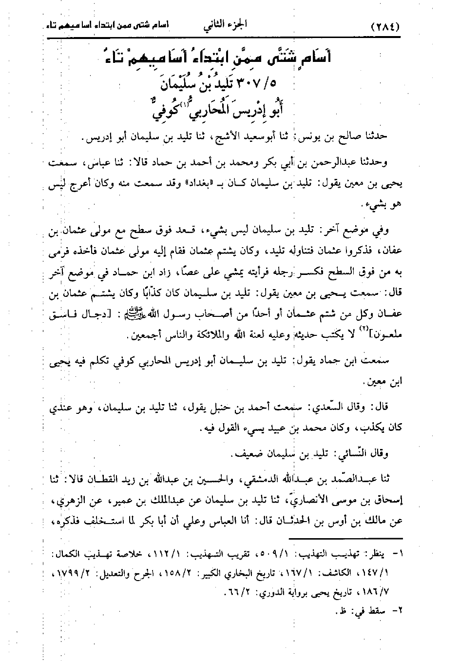 زاد ابْن حَمَّاد فِي موضع آخر، قَالَ: سَمِعْتُ يَحْيى بْن مَعِين يَقُولُ تليد بْن سُلَيْمَان كَانَ كذَّابًا وَكَانَ يشتم عُثْمَان بْن عفان وكل من شتم عُثْمَان أو أحدا من أصحاب رَسُول اللَّهِ صَلَّى اللَّهُ عَلَيْهِ وَسَلَّمَ دجال فاسق ملعون لا يكتب حديثه وعليه لَعْنَةِ اللَّهِ وَالْمَلائِكَةِ وَالنَّاسِ أَجْمَعِينَ.