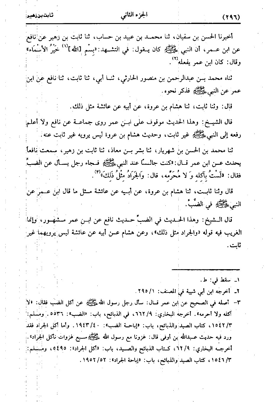 حَدَّثَنَا مُحَمد بْنُ الْحَسَنِ بْنِ شهريار، حَدَّثَنا بِشْرُ بْنُ مُعَاذٍ، حَدَّثَنا ثابت بن زهير سمعت نافع يُحَدِّثُ، عنِ ابْنِ عُمَر قَال: كنتُ جَالِسًا عِنْدَ النَّبِيِّ صَلَّى اللَّهُ عَلَيهِ وَسلَّمَ فَجَاءَ رَجُلٌ يَسْأَلُ عَنِ الضَّبِّ فَقَالَ لَسْتُ بِآكِلِهُ، ولاَ مُحَرِّمِهُ قَالَ وَالْجَرَادُ مثل ذلك.