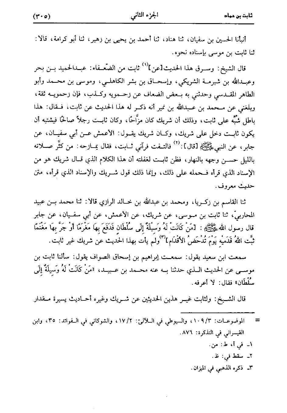 حَدَّثَنَا الْقَاسِمُ بْنُ زَكَرِيَّا، وَمُحمد بْنُ عَبد اللَّهِ بْنِ خَالِدٍ الرَّازِيُّ، قَالا: حَدَّثَنا مُحَمد بْنُ عُبَيد المحاربي، حَدَّثَنا ثَابِتُ بْنُ مُوسَى عَنْ شَرِيك، عَنِ الأَعْمَش، عَن أَبِي سُفيان، عَن جَابِرٍ قَال رَسُول اللهِ صَلَّى اللَّهُ عَلَيهِ وَسلَّمَ مِنَ كَانَتْ لَهُ وَسِيلَةٌ إِلَى سُلْطَانٍ فدفع بها مغرما أو جربها مَغْنَمًا ثَبَّتَ اللَّهُ قَدَمَيْهِ يَوْمَ تُدْحَضُ الأَقْدَامُ وَلَمْ يَأْتِ بِهَذَا الْحَدِيثِ عَنْ شَرِيك غَيْرُ ثَابِتٍ.