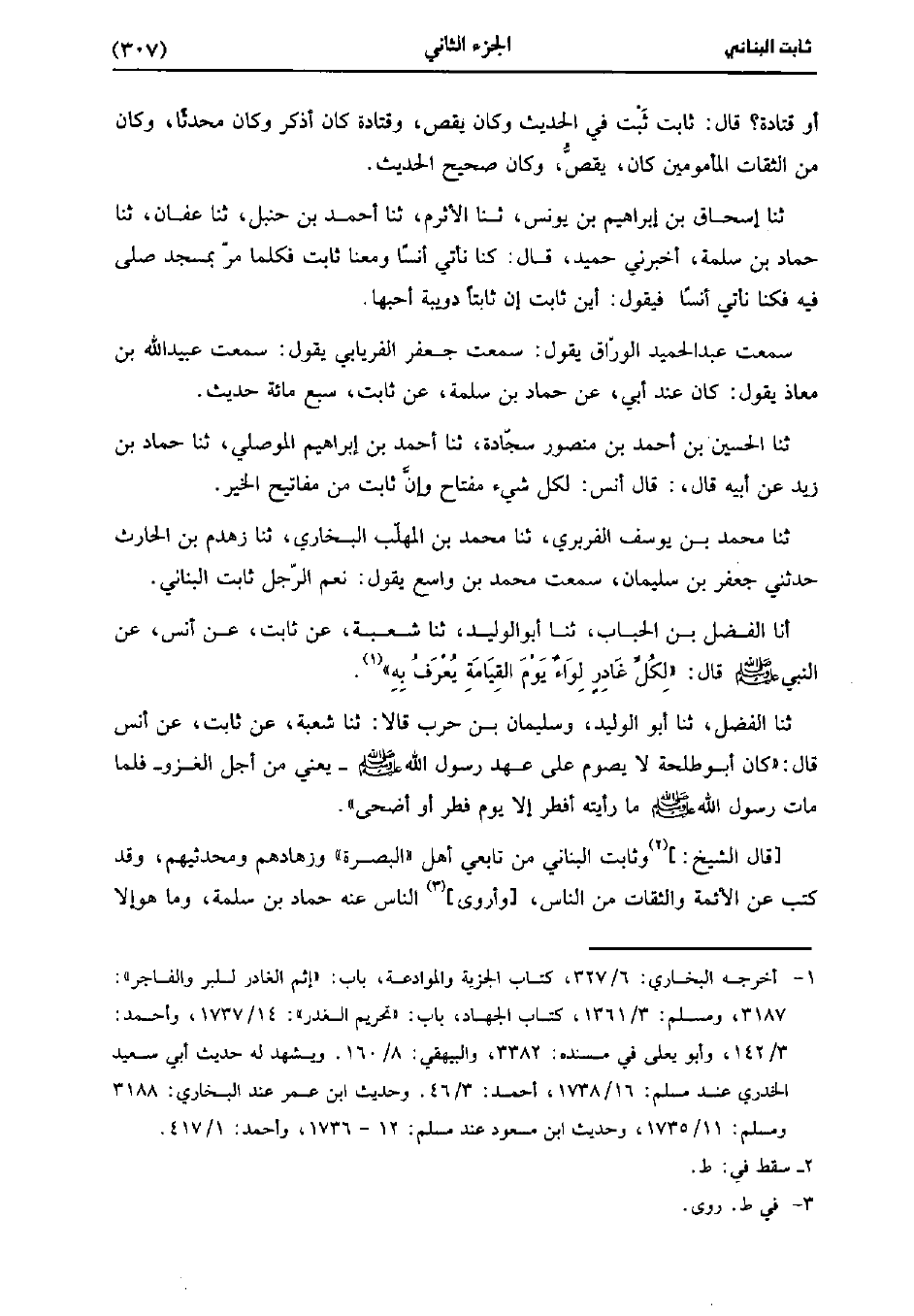 قَالَ الشَّيْخُ: وثابت البناني من تابعي أهل البصرة وزهادهم ومحدثيهم وقد كتب عَن الأئمة والثقات من النَّاس وأروى النَّاس عَنْهُ حَمَّاد بْن سلمة وما هُوَ إلا