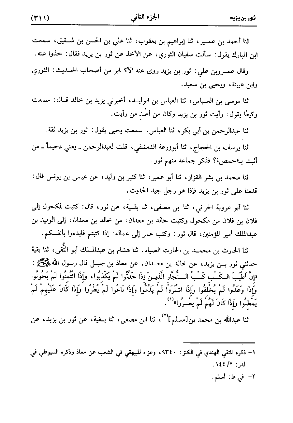 حَدَّثَنَا الْحَارِثُ بْنُ مُحَمد بْنِ الحارث الصياد، حَدَّثَنا هِشَامُ بْنُ عَبد الْمَلِكِ أَبُو التقى، حَدَّثَنا بَقِيَّةُ، حَدَّثني ثَوْرُ بْنُ يَزِيدَ عَنْ خَالِدِ بْنِ مِعْدَانَ عَنْ مُعَاذِ بْنِ جَبَلٍ قَال رَسُول اللهِ صَلَّى اللَّهُ عَلَيهِ وَسلَّمَ: إِنَّ أَطْيَبَ الْكَسْبِ كَسْبُ التُّجَّارِ الَّذِينَ إِذَا حَدَّثُوا لَمْ يَكْذِبُوا، وَإذا ائْتُمِنُوا لَمْ يَخُونُوا، وَإذا وَعَدُوا لَمْ يُخْلِفُوا، وَإذا اشْتَرَوْا لَمْ يَذُمُّوا، وَإذا بَاعُوا لَمْ يُطْرُوا، وَإذا كَانَ عَلَيْهِمْ لَمْ يَمْطُلُوا، وَإذا كَانَ لَهُمْ لَمْ يعسروا.