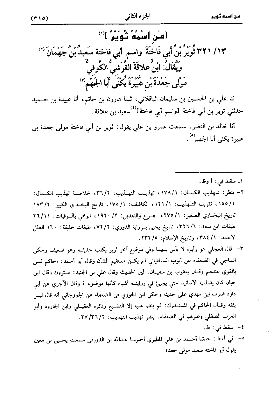 321- ثوير بن أَبِي فاختة سَعِيد بْن جهمان ويقال ابْن علاقة القرشي الْكُوفِيّ مولى جعدة بْن هبيرة، يُكَنَّى أبا الجهم.