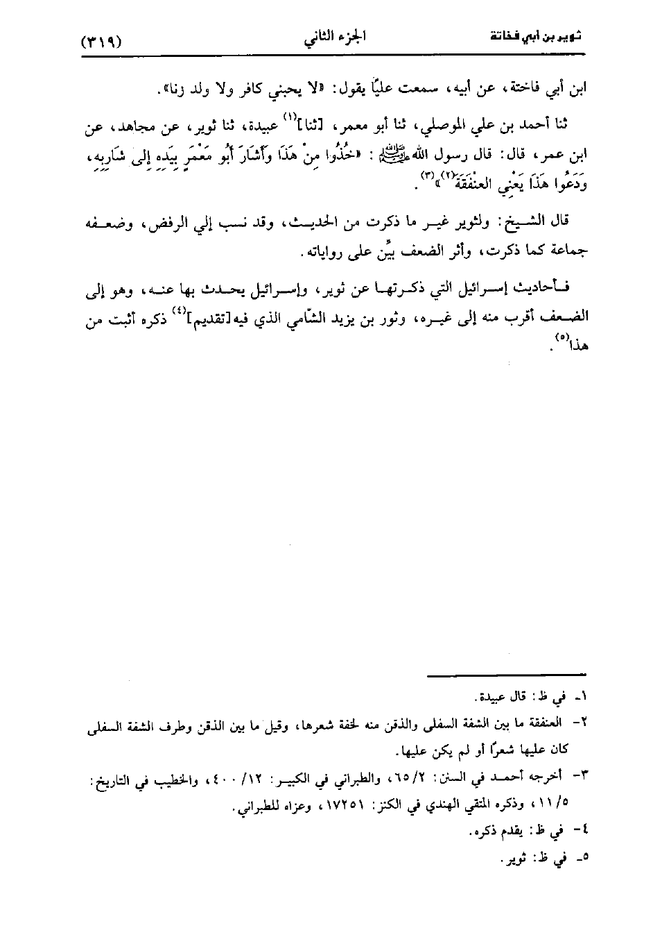 حَدَّثَنَا أَحْمَدُ بْنُ عَلِيٍّ الْمَوْصِلِيُّ، حَدَّثَنا أبو معمر، حَدَّثَنا عبيدة، حَدَّثَنا ثُوَيْرٍ عَنْ مُجَاهِدٍ، عنِ ابْنِ عُمَر، قَال: قَال رَسُولُ اللَّهِ صَلَّى اللَّهُ عَلَيْهِ وَسَلَّمَ خُذُوا مِنَ هَذَا وَأَشَارَ أَبُو مَعْمَرٍ بِيَدِهِ إِلَى شَارِبِهِ وَدَعُوا هَذَا يَعْنِي الْعَنْفَقَةَ.