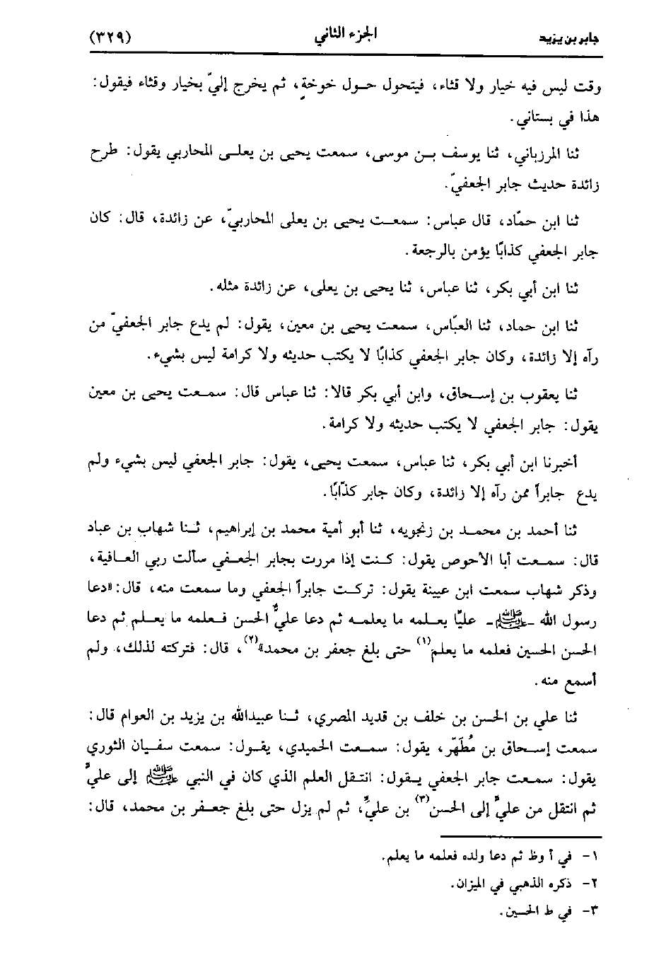 حَدَّثَنَا أَحْمَدُ بْنُ مُحَمد بْنِ زَنْجَوَيْهِ، حَدَّثَنا أَبُو أُمَيَّةَ مُحَمد بْنُ إبراهيم، حَدَّثَنا شهاب بن عباد قَالَ سَمِعْتُت أَبَا الأَحْوَصِ يَقُولُ كُنْتُ إِذَا مَرَرْتُ بِجَابِرٍ الْجُعْفِيِّ سَأَلْتُ رَبِّي الْعَافِيَةَ وَذَكَرَ شِهَابٌ سمعتُ ابْنَ عُيَينة يقول تركت جابر الْجُعْفِيَّ وَمَا سَمِعْتُ مِنْهُ قَالَ دَعَا رَسُولُ اللَّهِ صَلَّى اللَّهُ عَلَيْهِ وَسَلَّمَ عَلِيًّا يُعْلِمُهُ مَا يَعْلَمُهُ ثُمَّ دَعَا عَلِيٌّ الْحَسَنَ فَعَلَّمَهُ مَا يَعْلَمُ ثُمَّ دَعَا الْحَسَنُ الْحُسَيْنَ فَعَلَّمَهُ مَا يَعْلَمُ حَتَّى بِلَغَ جَعْفَرَ بْنَ مُحَمد قَالَ فَتَرَكْتُهُ لِذَلِكَ وَلَمْ أَسمَعْ منه.
