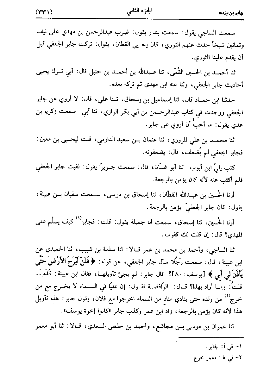 - حَدَّثَنَا السَّاجِيُّ وَأَحْمَدُ بْنُ مُحَمد بْنِ عُمَر، قَالا: حَدَّثَنا سَلَمَةُ بْنُ شَبِيبٍ، حَدَّثَنا الْحُمَيْدِيُّ، عنِ ابْنِ عُيَينة، قَالَ: سَمِعْتُ رَجُلا سَأَلَ جَابِرَ الْجُعْفِيَّ عَنْ قَوْلِهِ فَلَنْ أَبْرَحَ الأَرْضَ حتى يأذن لي أبي قَالَ جَابِرٌ لَمْ يَجِئْ تَأْوُيلُهَا وَقَالَ ابْنُ عُيَينة كَذَبَ قُلْتُ وما أراد بها قَالَ الرَّافِضَةُ تَقُولُ أَنَّ عَلِيًّا فِي السَّمَاءِ لا يَخْرَجُ مِعَ مَنْ خَرَجَ مِنْ وَلَدِهِ حَتَّى يُنَادِيَ مُنَادٍ مِنَ السَّمَاءِ اخْرُجُوا مَعَ فَلانٍ يَقُولُ جَابِرٌ هَذَا تَأوِيلُ هَذَا لأَنَّهُ كَانَ يُؤْمِنُ بالرجعة زاد بن عُمَر وَكَذَبَ جَابِرٌ كَانُوا إِخوة يوسف.