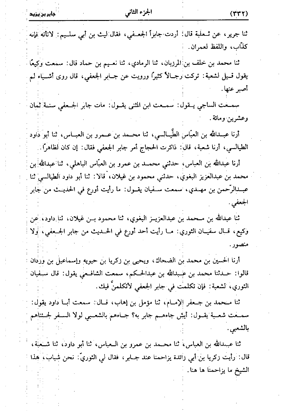 أَخْبَرَنَا عَبد اللَّهِ بْنُ الْعَبَّاسِ، حَدَّثني مُحَمد بْنُ عَمْرو بْنِ العباس الباهلي، حَدَّثَنا عَبد اللَّه بْنُ مُحَمد بْن عَبد العزيز البغوي، حَدَّثني محمود بن غيلان، قالا: حَدَّثَنا أبو داود الطيالسي، حَدَّثَنا عَبد الرَّحْمَنِ بْنُ مَهْدِيٍّ سَمِعْتُ سفيان يَقُولُ ما رأيت أورع فِي الْحَدِيث من جَابِر الجعفي.