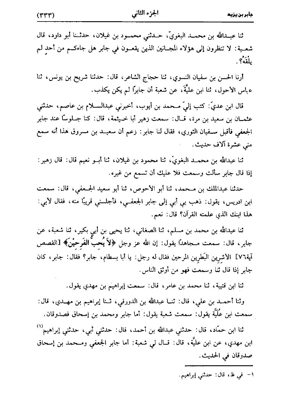 حَدَّثَنَا عَبد اللَّهِ بْنُ مُحَمد بن مسلم، حَدَّثَنا الصغاني، حَدَّثَنا يَحْيى بْنُ أَبِي بُكَير، حَدَّثَنا شُعْبَة عن جابر سمعت مجاهد يَقُولُ إِنَّ اللَّهَ عَزَّ وَجَلَّ لا يحب الفرحين الأَشِرِينَ الْبَطِرِينَ الْمَرِحِينَ فَقَالَ لَهُ رَجُلٌ يَا أَبَا بِسْطَامٍ جَابِرٌ فَقَالَ جَابِرٌ كَانَ جَابِرٌ إِذَا، قَال: حَدَّثَنا وَسَمِعْتُ فَهُوَ مِنْ أَوْثَقِ النَّاسِ.