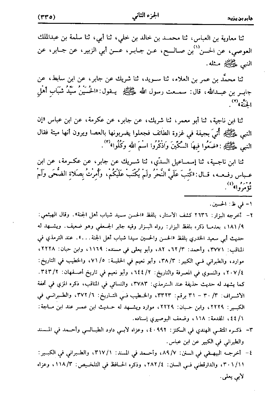 حَدَّثَنَا مُحَمد بْنُ عُمَر بْنِ الْعَلاءِ، حَدَّثَنا سويد، حَدَّثَنا شَرِيك، عَنْ جَابِرٍ، عنِ ابْنِ سَابِطٍ عَنْ جَابِرِ بْنِ عَبد اللَّهِ، قَالَ: سَمِعْتُ رَسُولَ اللَّهِ صَلَّى اللَّهُ عَلَيْهِ وَسَلَّمَ يَقُولُ الْحُسَيْنُ سَيِّدُ شَبَابِ أَهْلِ الْجَنَّةِ.