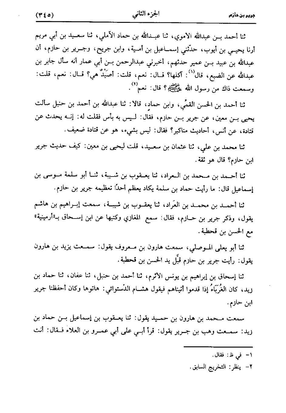 حَدَّثَنَا أَبُو يعلى الموصلي سَمِعْتُ هارون بْن معروف يَقُولُ: سَمعتُ يزيد بْن هارون يَقُولُ رأيت جرير بْن حازم قبل يد الْحَسَن بْنِ قَحْطَبَةَ.