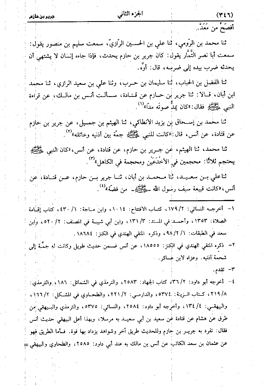 حَدَّثَنَا الْفَضْلُ بْنُ الْحُبَابِ، حَدَّثَنا سليمان بن حرب وَحَدَّثنا عَلِيُّ بْنُ سَعِيد الرَّازِيُّ، حَدَّثَنا مُحَمد بن أَبَان، قالا: حَدَّثَنا جَرِيرُ بْنُ حَازِمٍ، عَن قَتادَة سَأَلْتُ أَنَسَ بْنِ مَالِكٍ عَنْ قِرَاءَةِ النَّبِيِّ صَلَّى اللَّهُ عَلَيهِ وَسلَّمَ فَقَالَ: كَانَ يَمُدُّ صوته مدا.