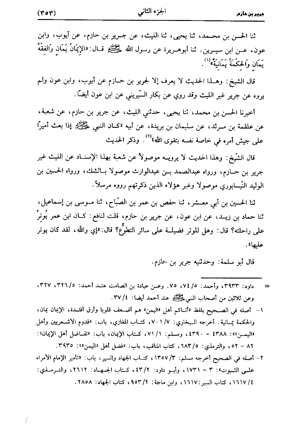 حَدَّثَنَا الحسن بن مُحَمد، حَدَّثَنا يَحْيى، حَدَّثَنا اللَّيْثُ عَنْ جَرِيرِ بْنِ حَازِمٍ عَنْ أَيُّوبَ، وَابْنِ عَوْنٍ، عنِ ابن سِيرِين، حَدَّثَنا أَبُو هُرَيْرَةَ عَنْ رَسُولِ اللَّهِ صَلَّى اللَّهُ عَلَيْهِ وَسَلَّمَ صَلَّى اللَّهُ عَلَيه وسَلَّم قَال: الإِيمَانُ يَمَانٌ وَالْفِقْهُ يَمَانٌ وَالْحِكْمَةُ يَمَانِيَّةٌ.