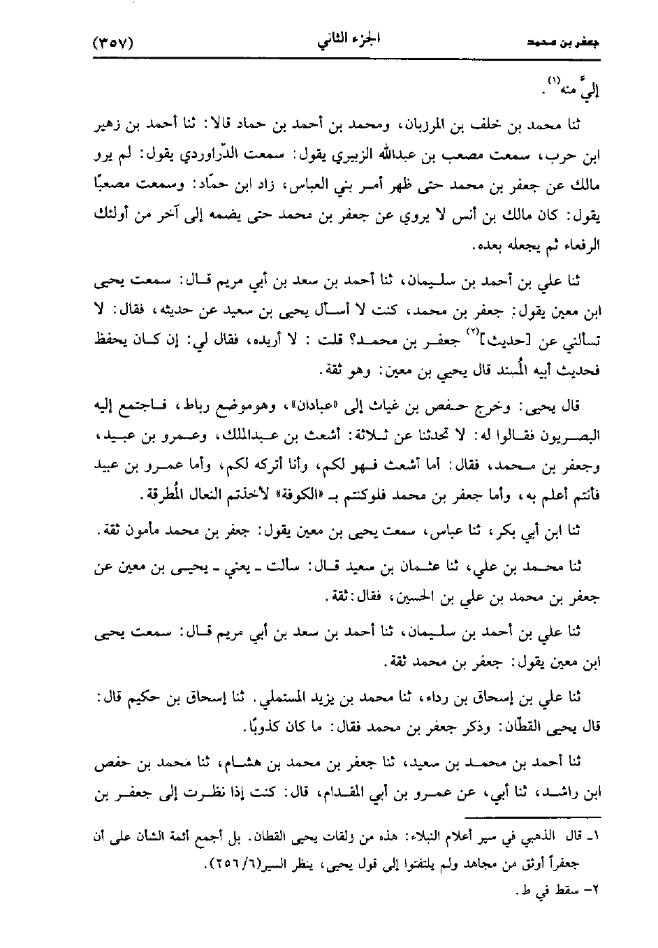 حَدَّثَنَا مُحَمد بْنُ خَلَفِ بْنِ المرزبان، وَمُحمد بْن أَحْمَد بْن حماد، قالا: حَدَّثَنا أَحْمَد بْن زهير بْن حرب سَمِعْتُ مصعب بْن عَبد اللَّهِ الزبيري يَقُولُ: سَمعتُ الدراوردي يَقُولُ لم يرو مَالِك عَن جَعْفَر بْن مُحَمد حتى ظهر أمر بني العباس زاد بن حماد وسمعت مصعب يَقُولُ كَانَ مَالِكُ بْنُ أَنَسٍ لا يروي عَن جَعْفَر بْن مُحَمد حتى يضمه إلى آخر من أولئك الرفعاء ثم يجعله بعده.