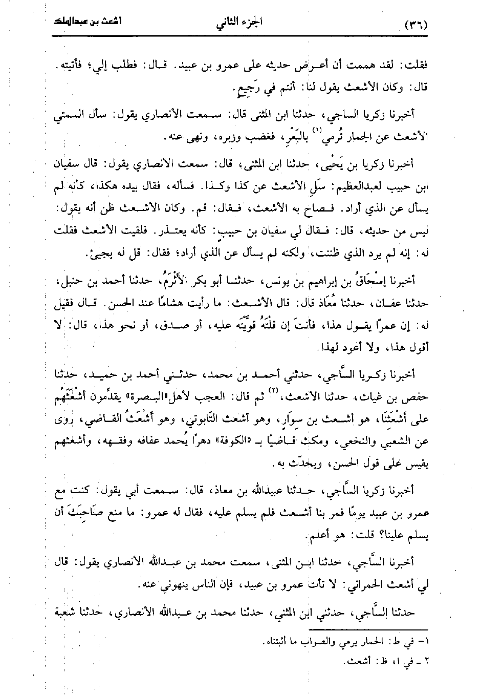 حَدَّثَنَا زكريا الساجي، حَدَّثَنا عُبَيد اللَّه بْنُ مُعَاذٍ، قَالَ: سَمِعْتُ أَبِي يَقُولُ كُنْتُ مَعَ عَمْرو بْنِ عُبَيد يَوْمًا فَمَرَّ بِنَا أَشْعَثُ فَلَمْ يُسَلِّمْ عَلَيْهِ فَقَالَ لَهُ عَمْرو مَا مَنَعَ صَاحِبَكَ أَنْ يُسَلِّمَ عَلَيْنَا قُلْتُ هُوَ أَعْلَمُ.
