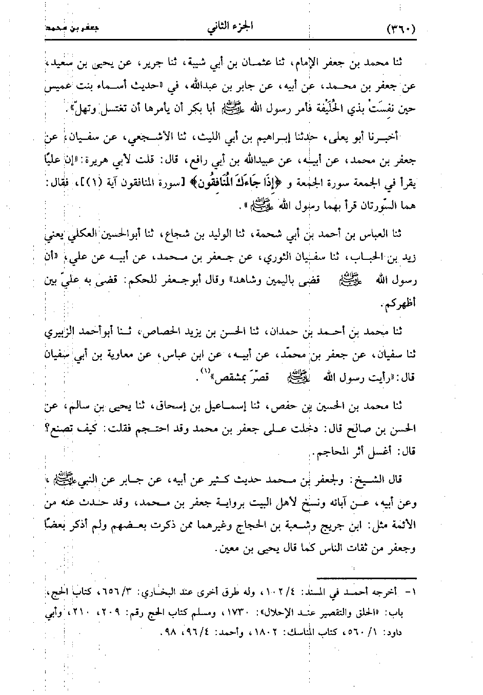 قَالَ الشَّيْخُ: ولجعفر بْن مُحَمد حديث كبير، عَن أبيه عن جابر وعن أبيه عن آبائه ونسخا لأهل البيت برواية جَعْفَر بْن مُحَمد وقد حدث عَنْهُ من الأئمة مثل بن جُرَيج، وشُعبة بن الحجاج وغيرهم ممن ذكرت بعضهم ولم أذكر بعضا وجعفر من ثقات النَّاس كَمَا قَالَ يَحْيى بْنُ مَعِين