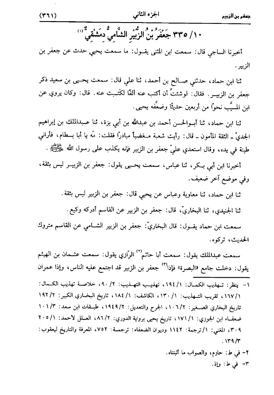 حَدَّثَنَا ابن حماد، حَدَّثَنا معاوية وعباس، عَن يَحْيى، قَالَ: جَعْفَر بْن الزبير لَيْسَ بثقة.